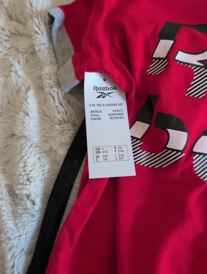 Ensemble Reebok Neuf avec étiquette et emballage Taille 3/4 ans Pantalon jogging gris et noir T-shirt rouge #ensemble #lot #reebok #4ans #neuf #tshirt #pantalon #jogging #survetement 8