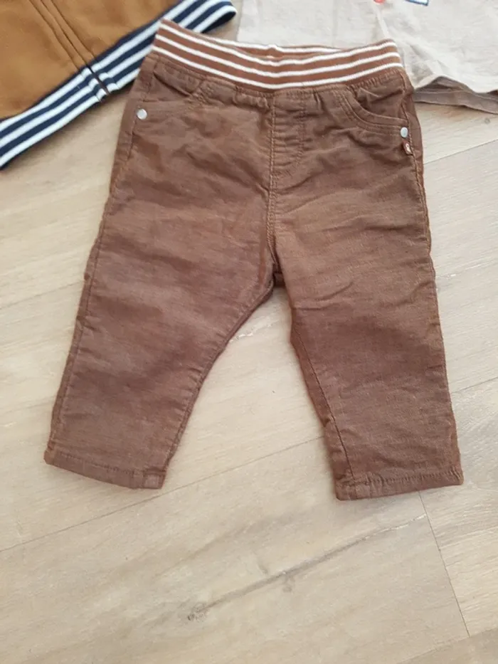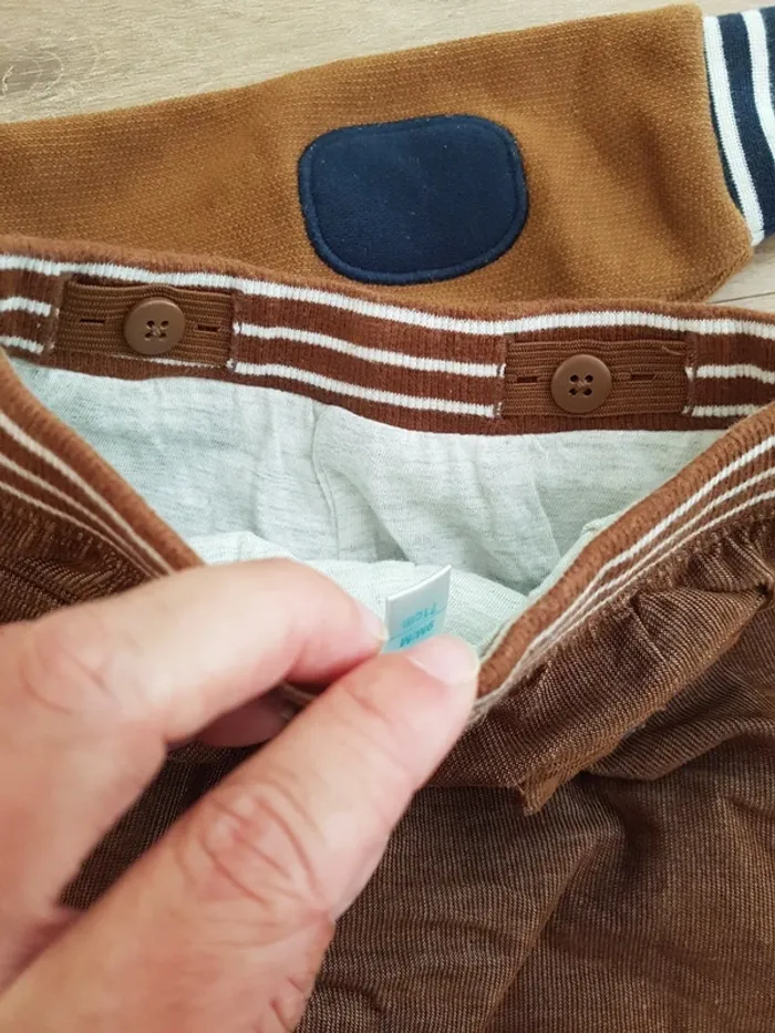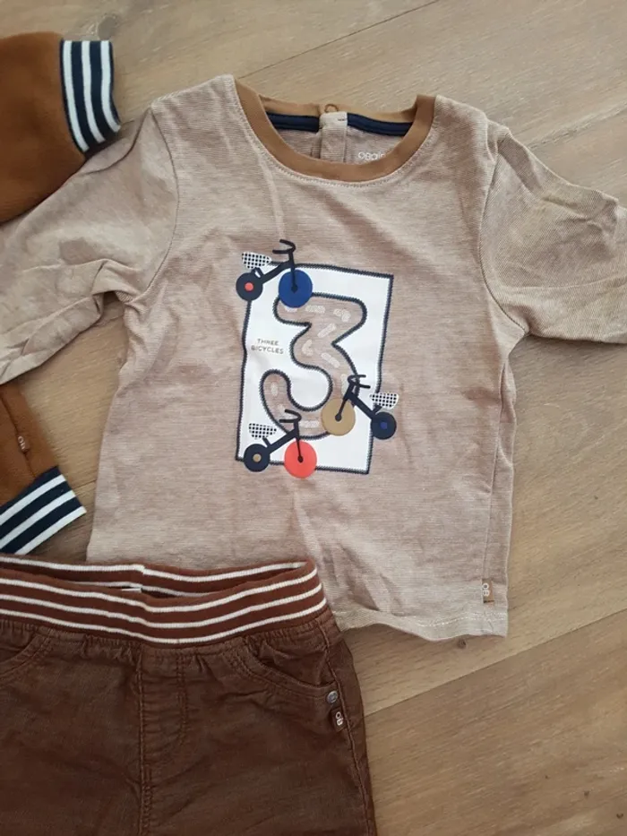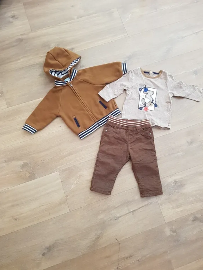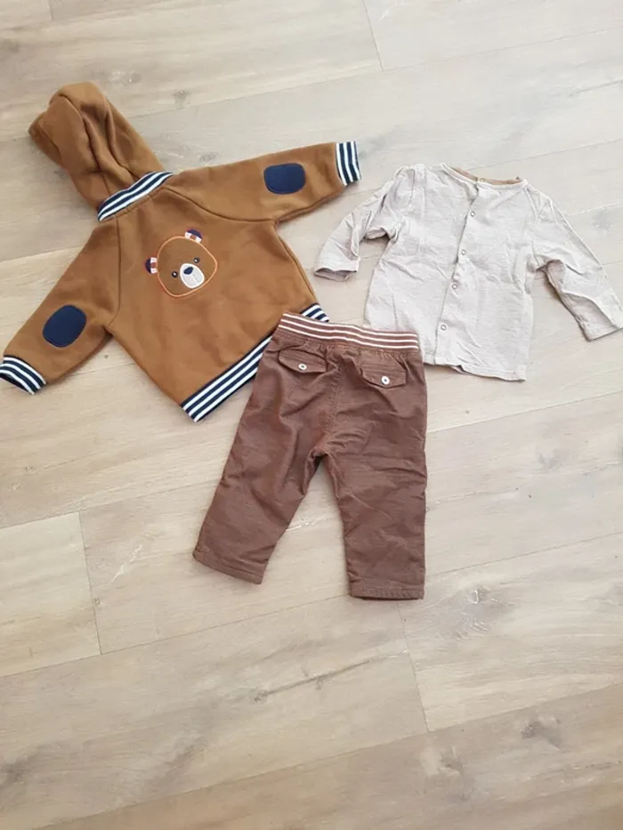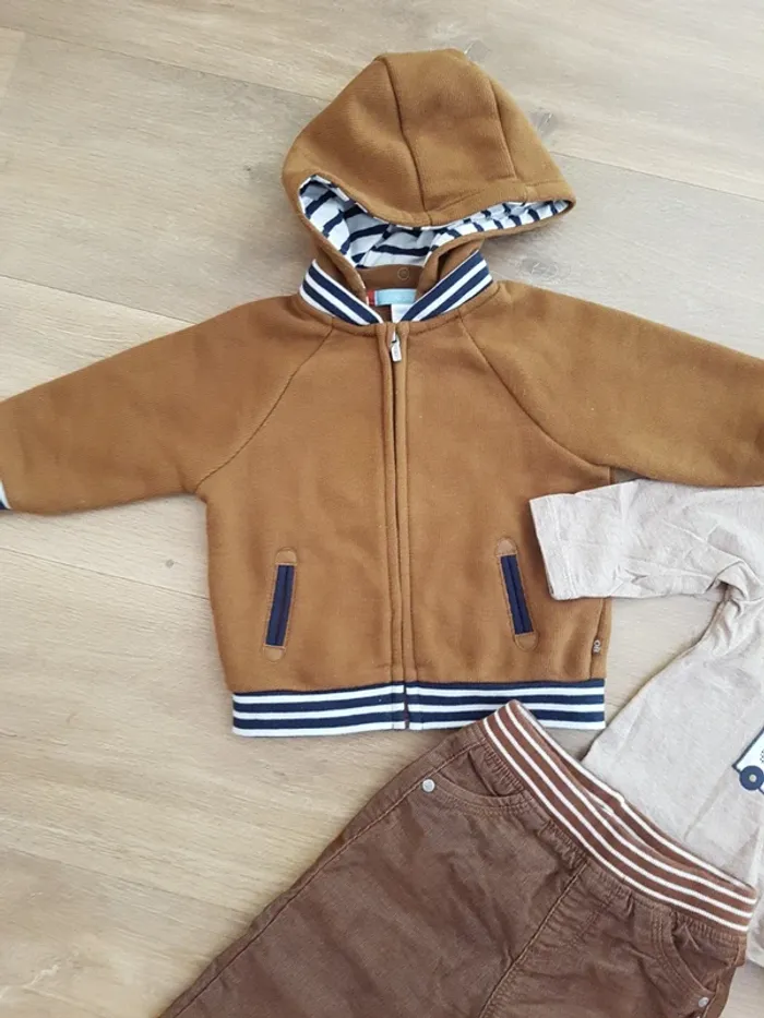 Magnifique ensemble Obaïbi 9 mois 71 cm comprenant un t-shirt manches longues, ouverture complète dans le dos, un sweat à capuche amovible et un pantalon velours doublé assez chaud Je n'ai pas le souvenir de l'avoir mis à mon enfant!