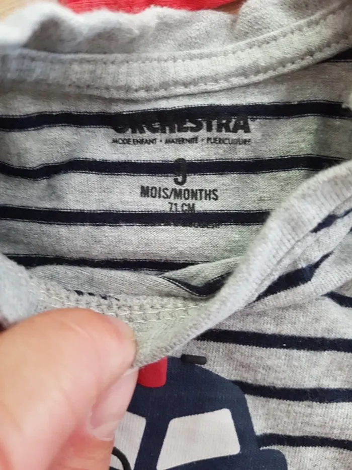 Lot de 2 hauts manches longues 9 mois 71 cm Le gris à rayures Orchestra Et le rouge bébé rêve, un petit trou à été reprisé voir photo