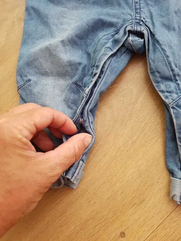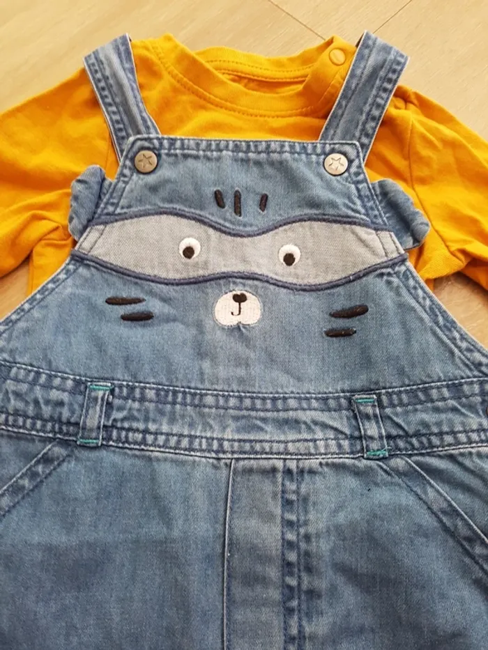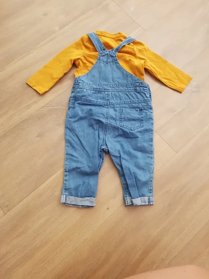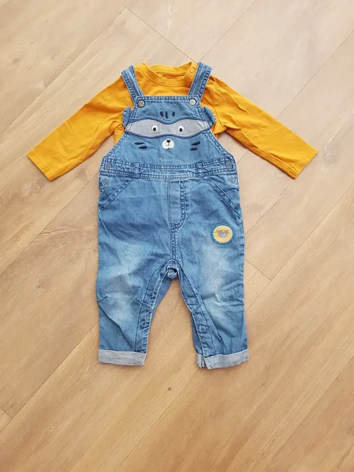 Adorable ensemble en taille 9 mois comprenant un t-shirt manches longues et une salopette en jeans qui s'ouvre à l'entre jambe pour faciliter le change