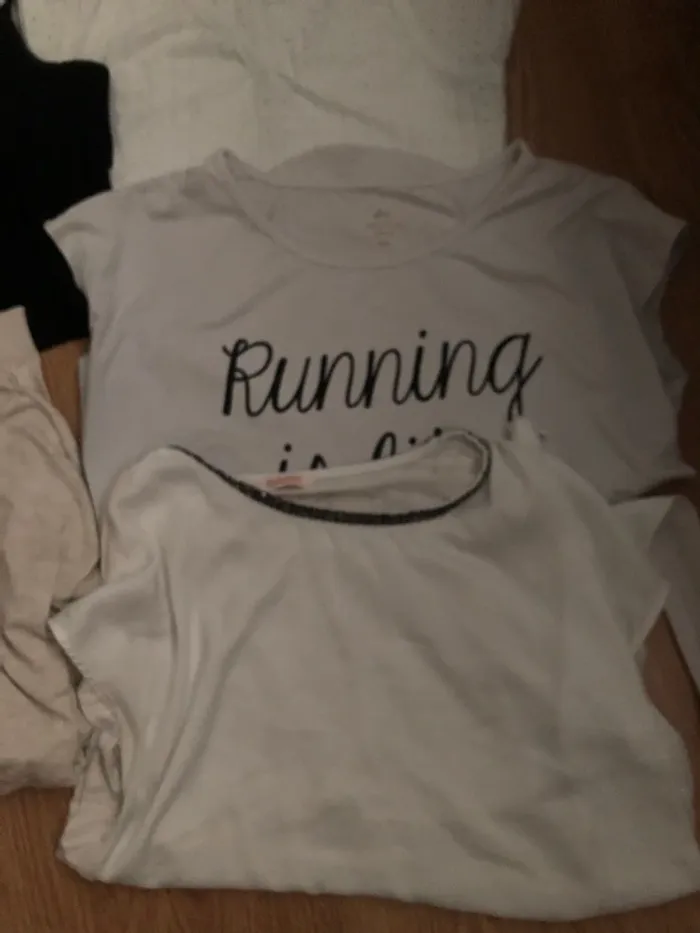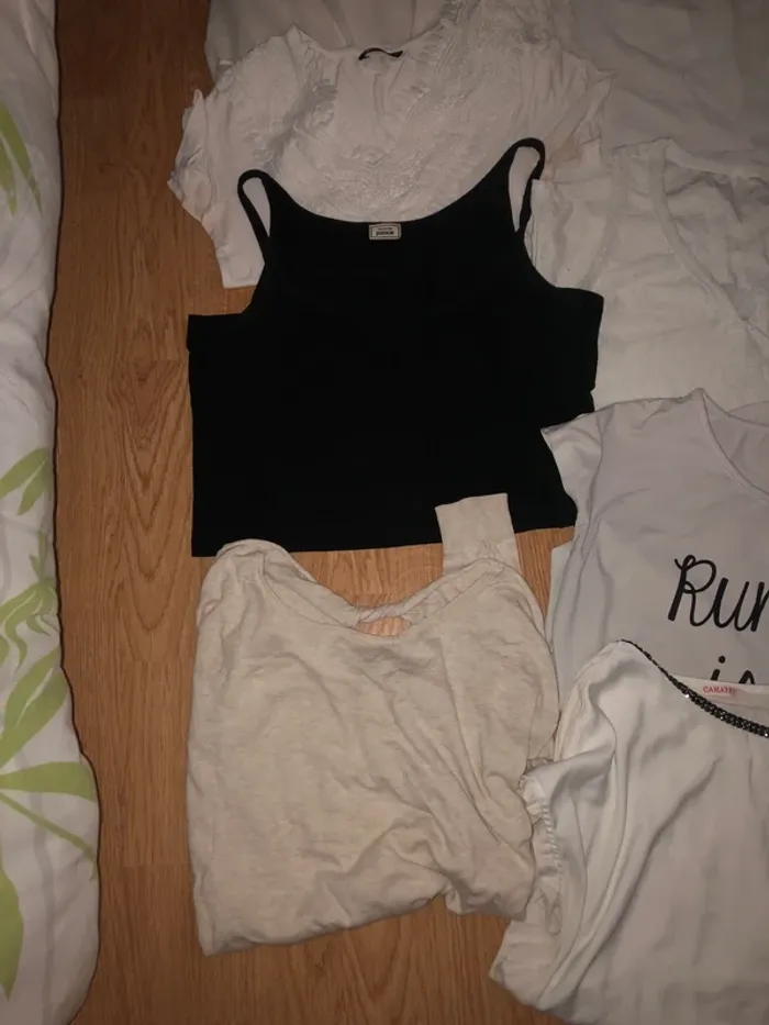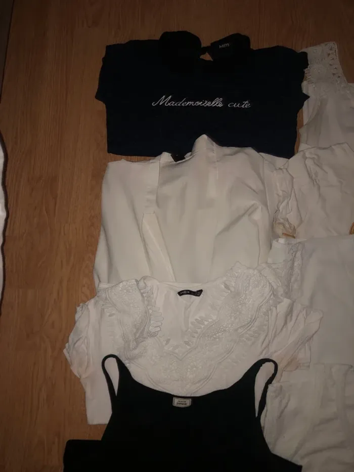 Taille 36 Certains tachés aux aiselles 1 seul pull fin petit trou a l’aisselle Le t shirt bleu est casi neuf Toute marque