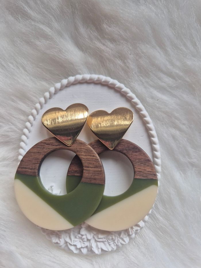 Ces boucles d'oreilles uniques combinent harmonieusement la résine kaki et beige avec du bois marron. Leurs clous en métal doré en forme de cœur ajoutent une touche d'élégance. La combinaison de ces éléments crée un accessoire distinctif. Les fermoirs en caoutchouc assurent un maintien confortable et sécurisé. Elles seront parfaites pour compléter une tenue décontractée ou plus sophistiquée.