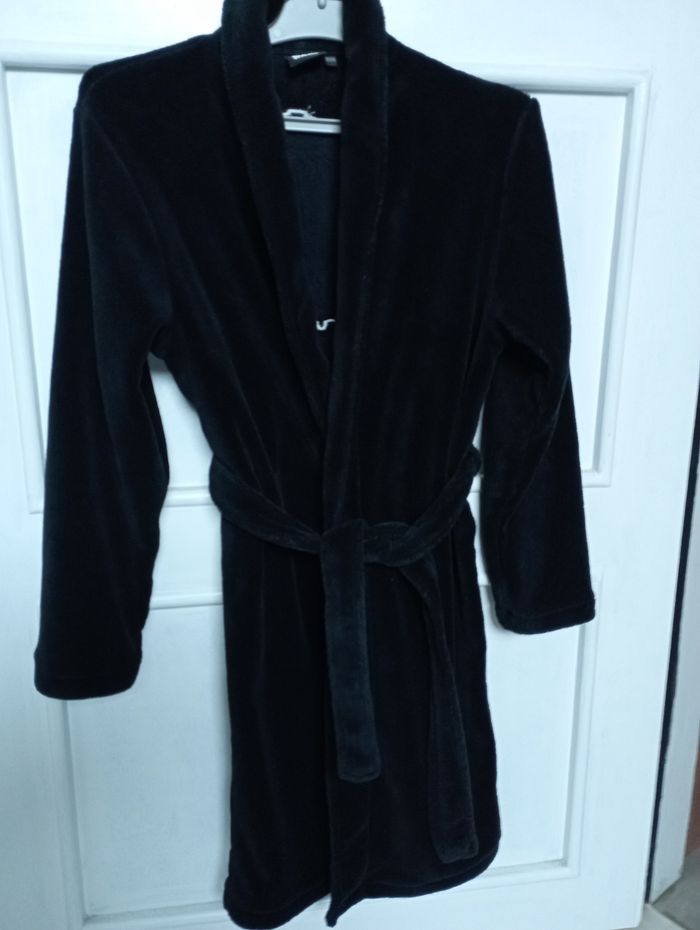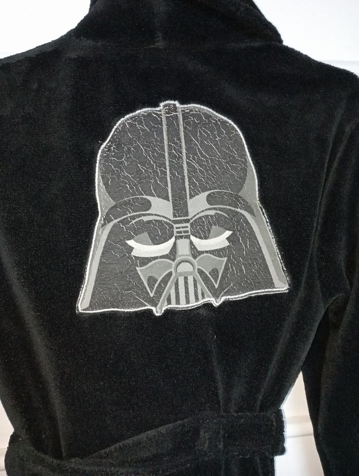 Robe de chambre noire toute douce en velours avec ceinture. Star wars, flocage tête dark Vador dans le dos. Taille 10 12 ans. Flocage un peu usé mais toujours complet. Voir photo