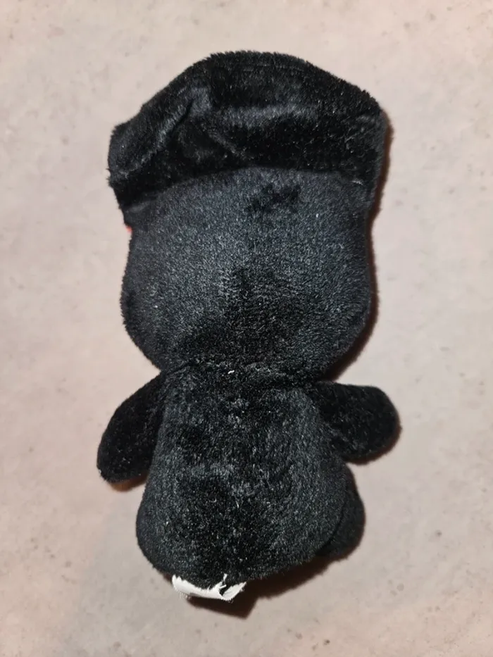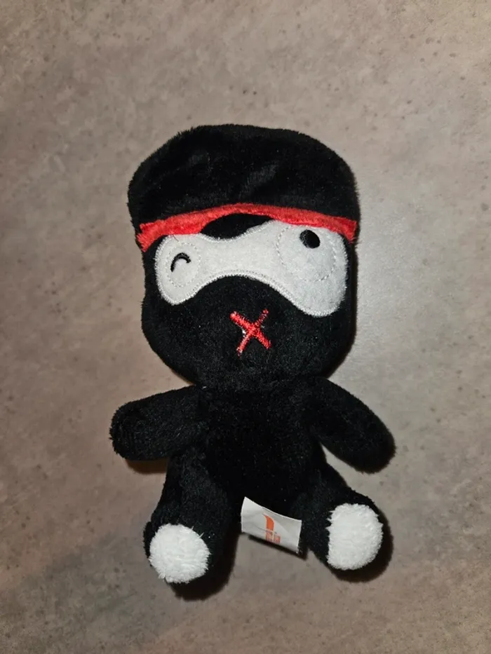 Peluche promotionnelle de la chaîne Buffalo Grill, représentant un petit ninja stylisé 🥷 Design noir avec masque, bandeau rouge et détails blancs sur les yeux et les pieds. Un "X" rouge est brodé sur le visage, ajoutant une touche mystérieuse. Taille : environ 15 cm 📦 Bon état – propre, sans défaut Objet rare et original, parfait pour les collectionneurs ou comme déco fun !