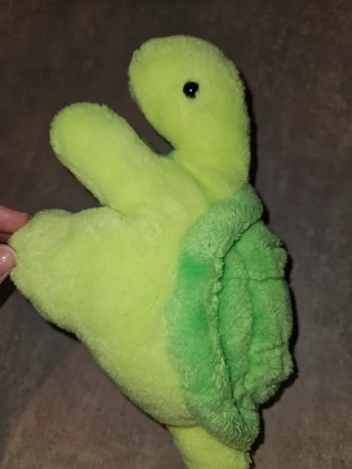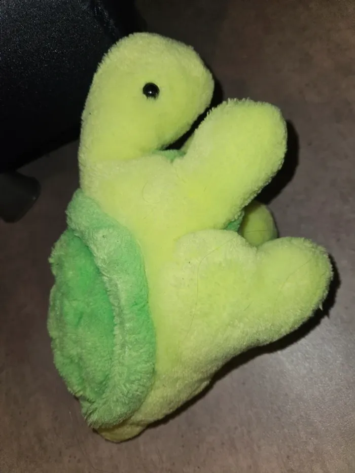 Adorable peluche tortue verte, en bon état et prête à trouver un nouveau foyer 💚 🐢 Corps en vert clair avec une carapace vert foncé 🧸 Texture douce et moelleuse, parfaite pour les câlins 🔸 Maison non fumeur, peluche propre 🔸 Convient aux enfants ou comme déco nature