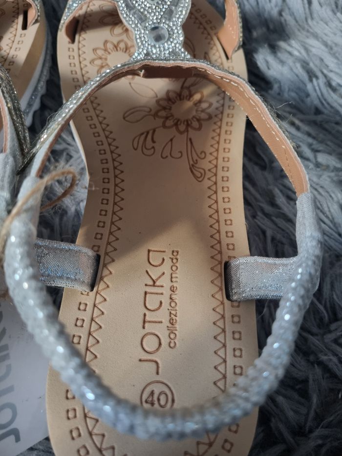 Sandales à strass argenté, pointure 40 marque Jotaka,élastique à l'arrière de la cheville, hauteur talons 5cm, légère, neuve avec étiquette.