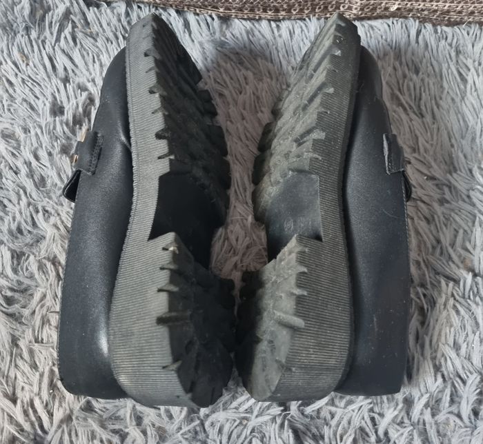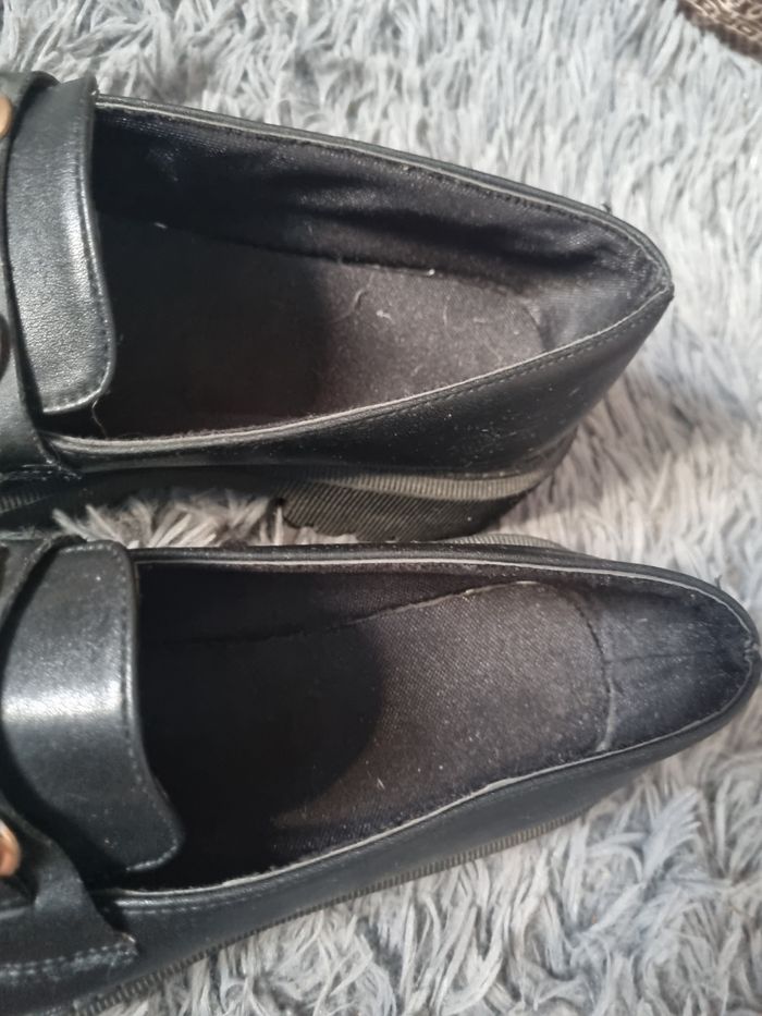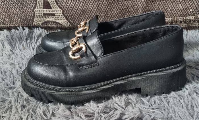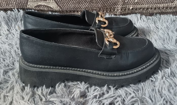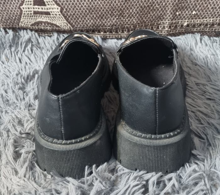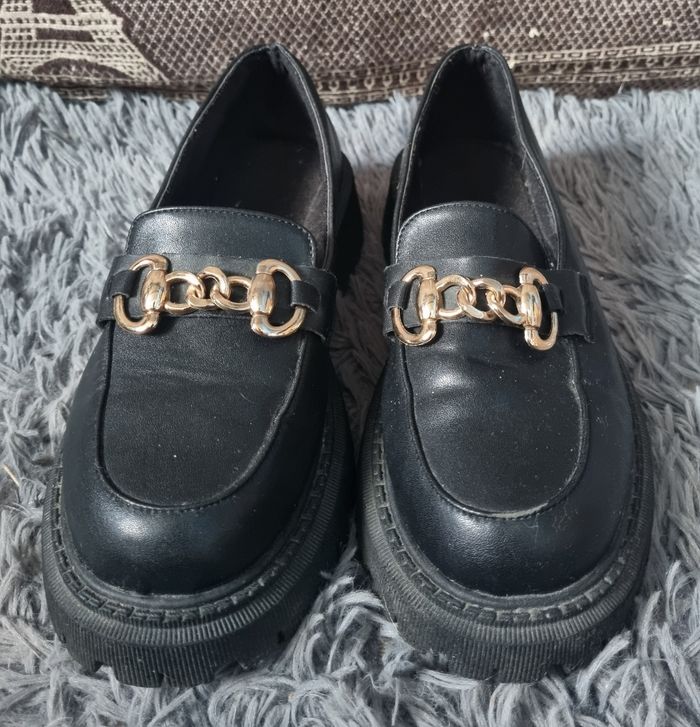 Mocassin noir avec chaîne doré style Mercredi Addams, pointure indiqué 250 se qui correspond à un 39.5 voir photo,sinon très peu porté 1-2fois, hauteur talons 5cm.