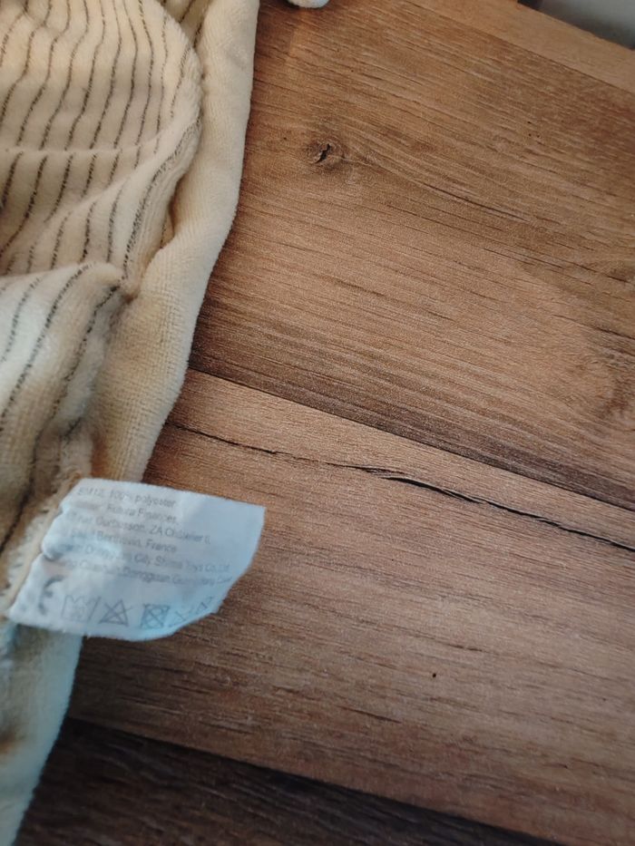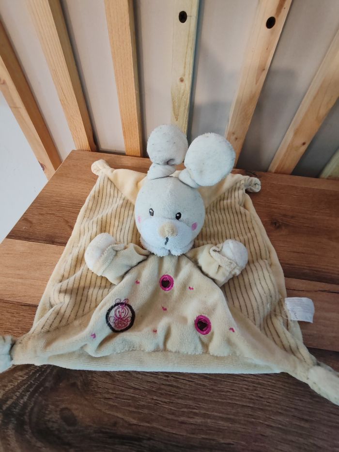 doudou lapin plat carré Ton beige rayures marron broderie coeur. Hochet . En très bon état Étiquette marque 12.90 euros Envoi en relais