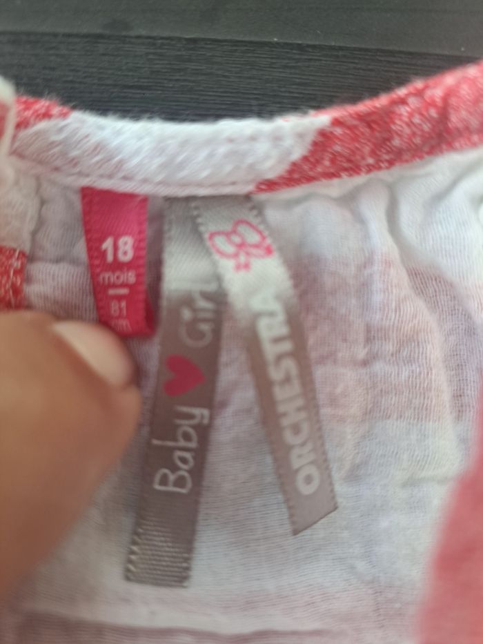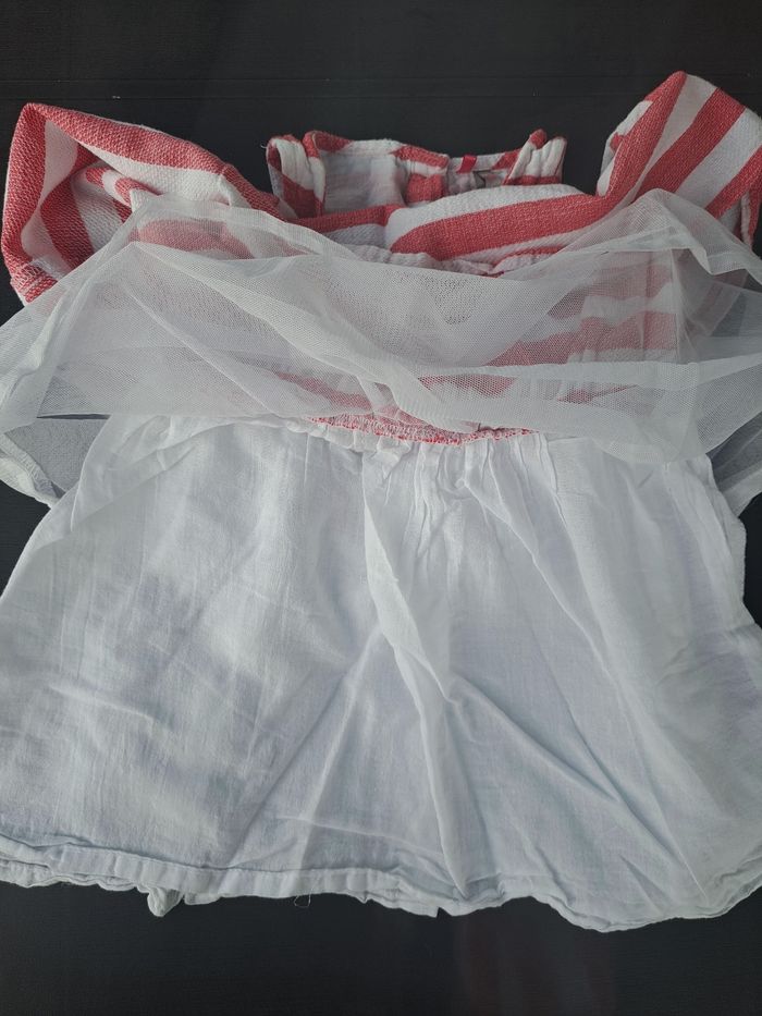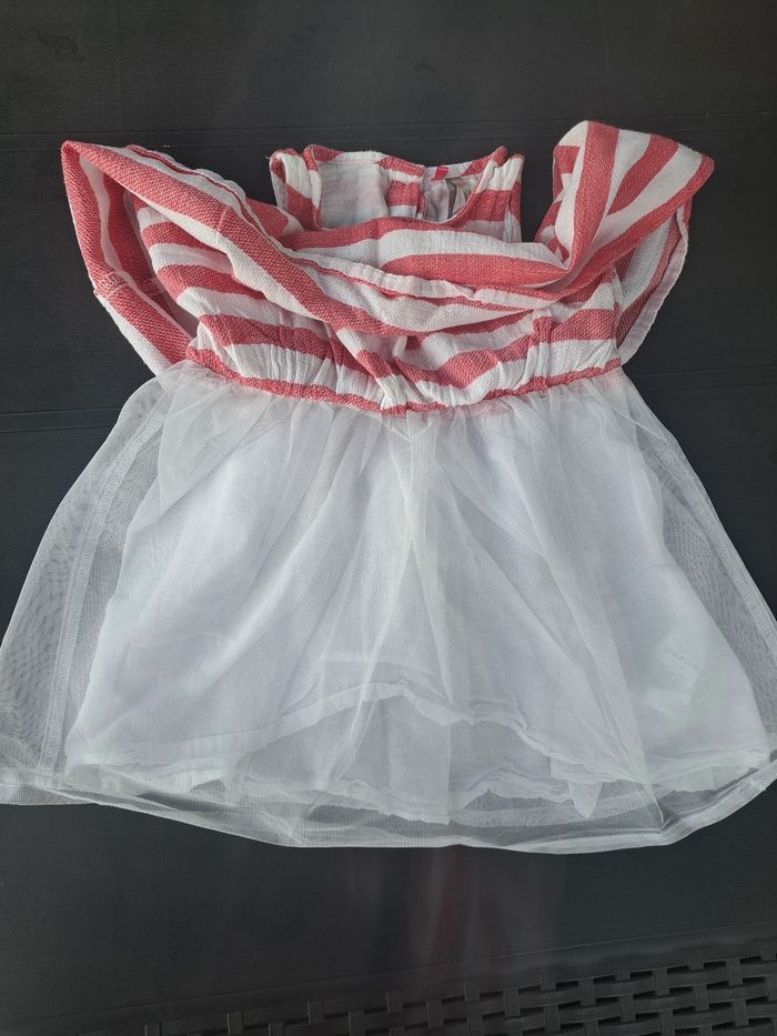 Porté. Ferme avec 3 boutons. Petit nœud sur la poitrine. Jupon et tulle pour donner du volume. 1 bouton supplémentaire cousus sur l'étiquette intérieur. Pas de trou, ni de tâches.