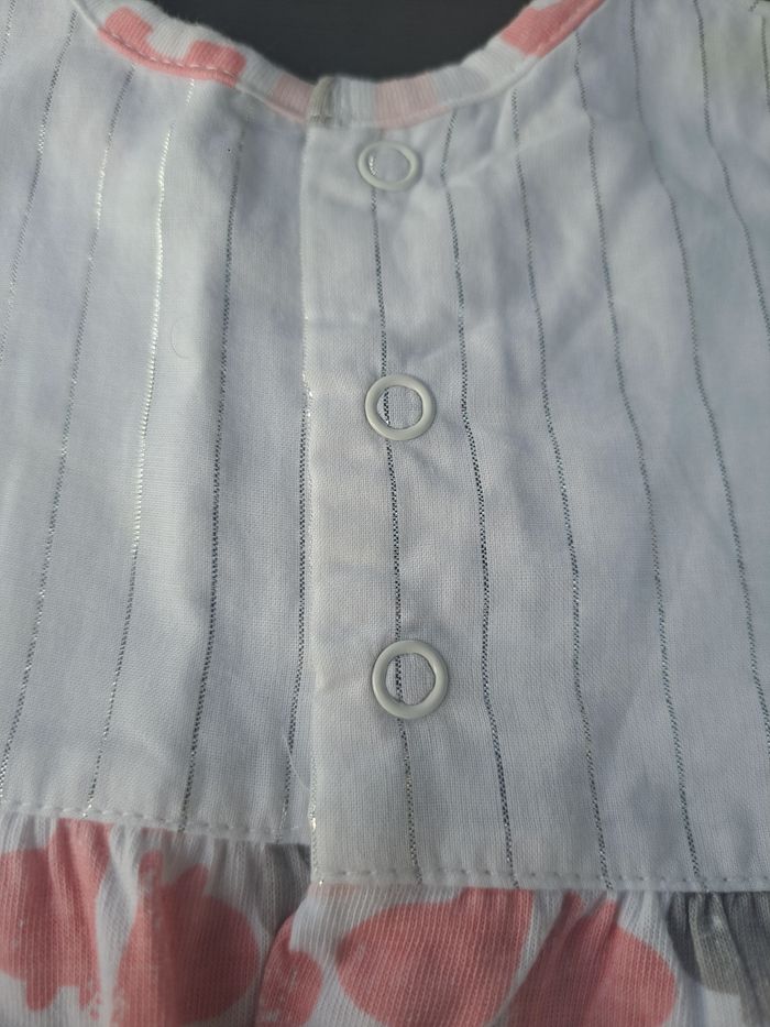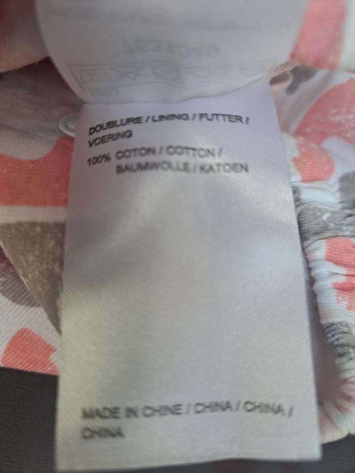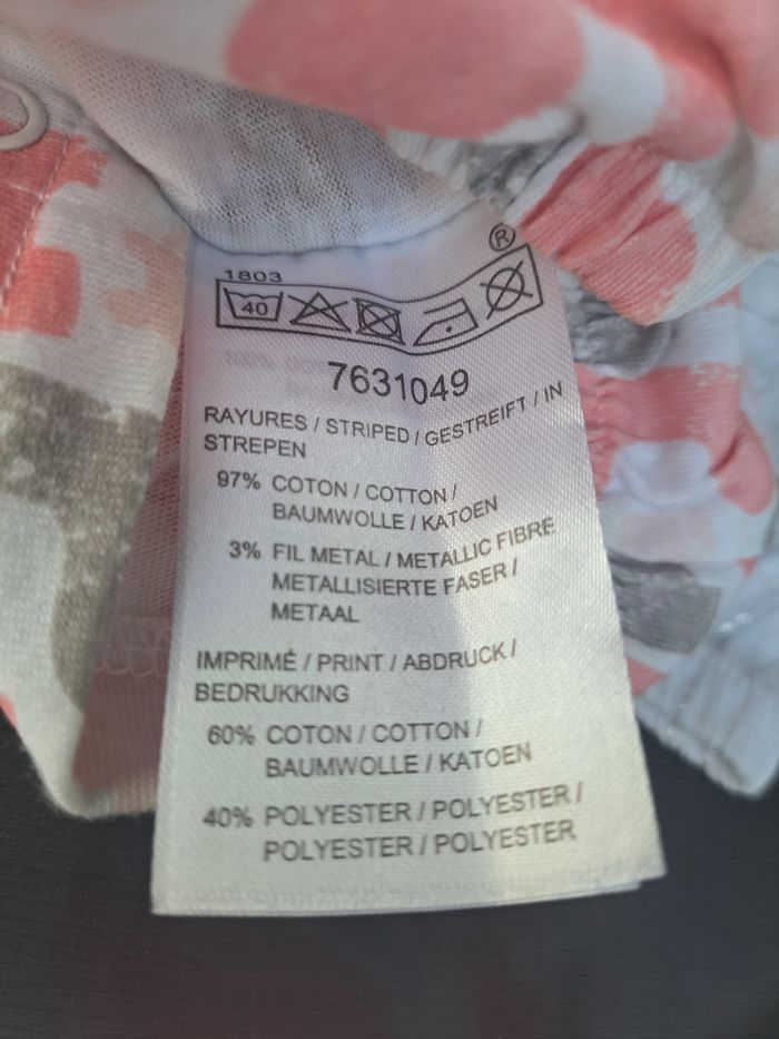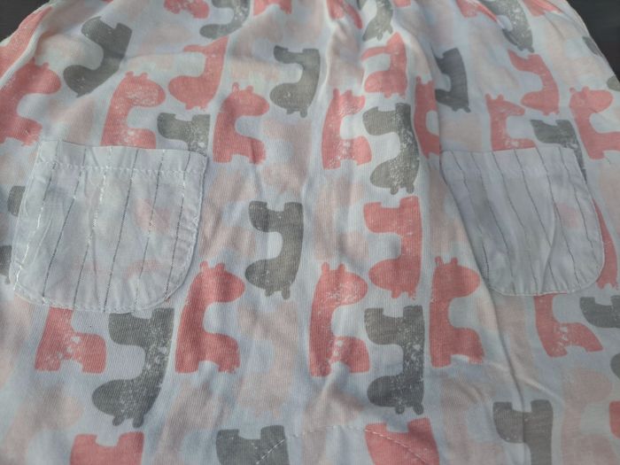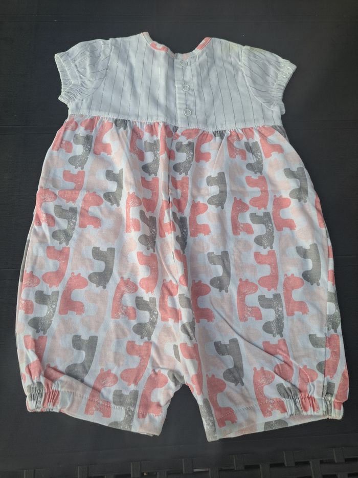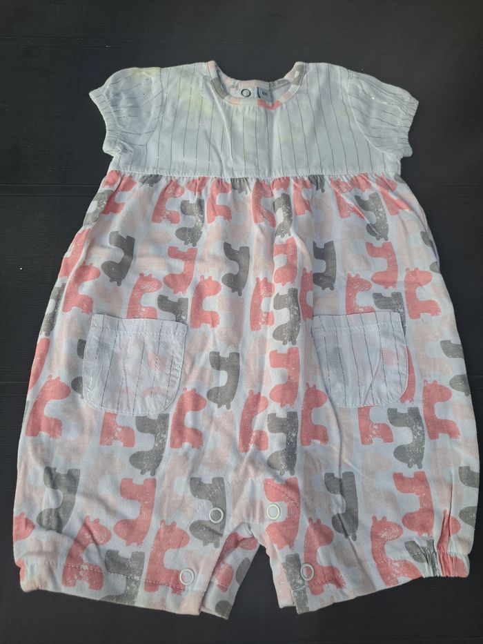 Porté. 1 pièce. Ferme avec 3 boutons pressions dans le dos 4 boutons pressions entre les jambes. 2 petites poches devant. Motif en bonne état. Pas de trou, ni de tâches.