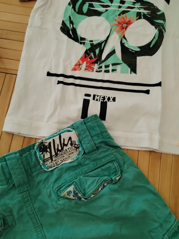 Ensemble composé d'1 short ikks vert 1peu turquoise(avec poches et effet piqué cf photos) et tee-shirt blanc motifs de marque mexx