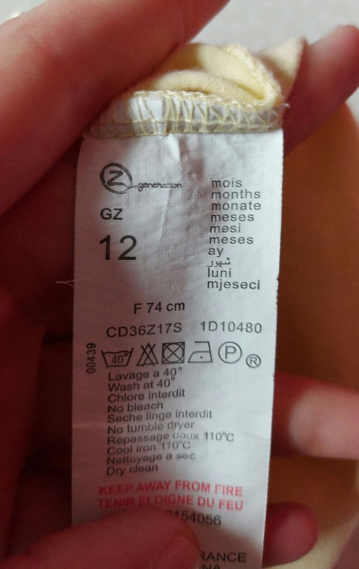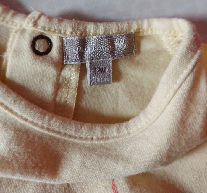 Je vends un t-shirt de couleur jaune avec un motif- des papillons avec des coutures de couleurs orange venant de chez Grain De Blé. Il possède des boutons à pression dans le dos pour facilité le passage de la tête. Taille : 12 mois (74 cm). Utilisé mais reste en bon état.