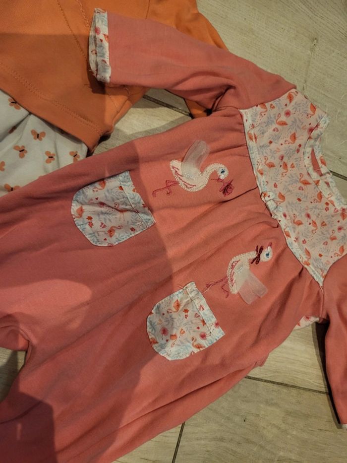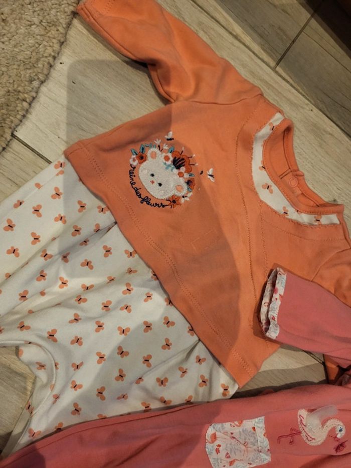 2 pyjamas sergent major taille 1 mois, le pyjama de gauche est couleur corail (la photo le fait ressortie orange)
