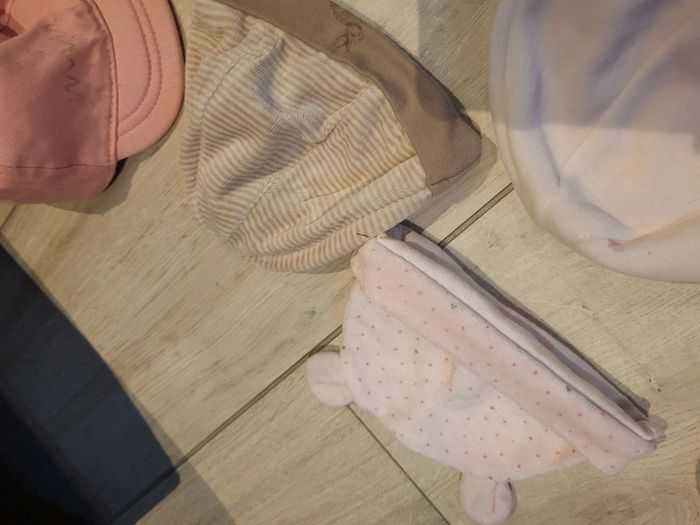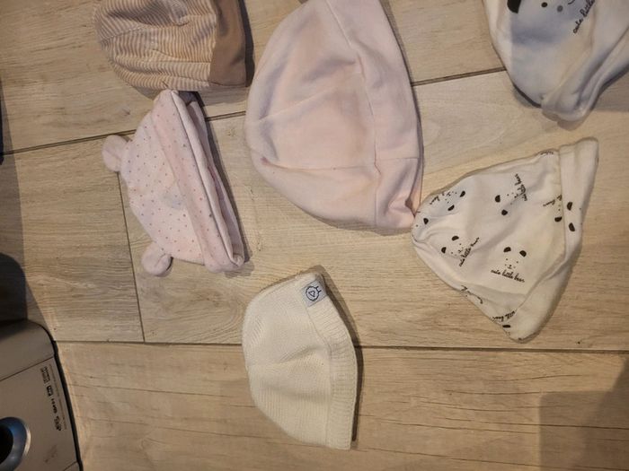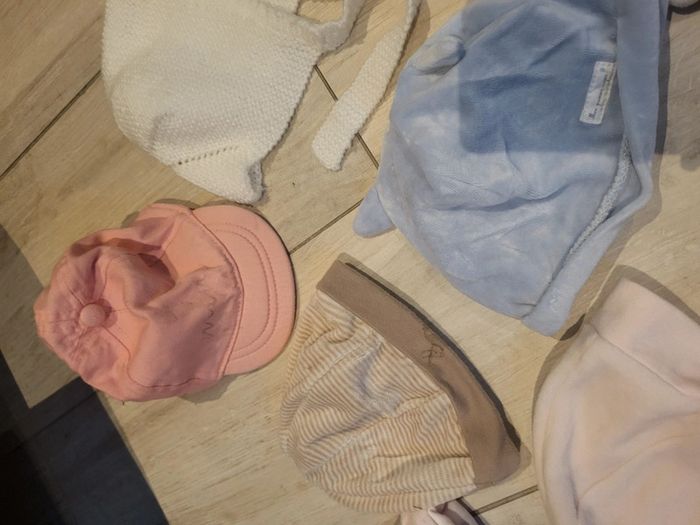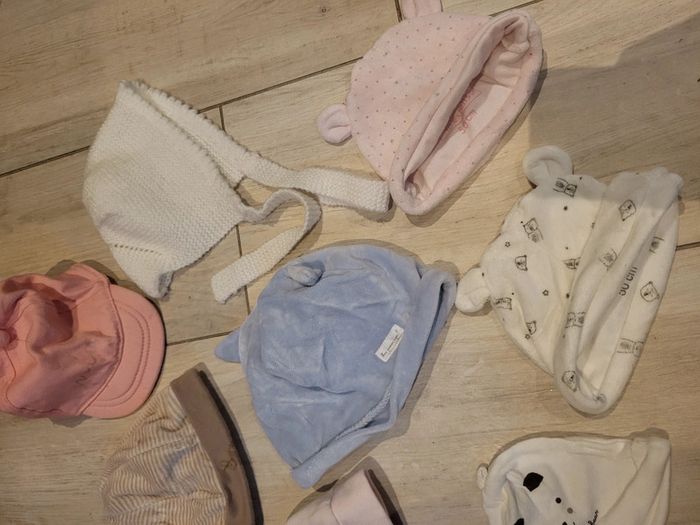 Lot bonnets bébé, différentes taille, du nourisson au 3mois environ + 1 casquette