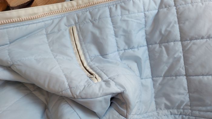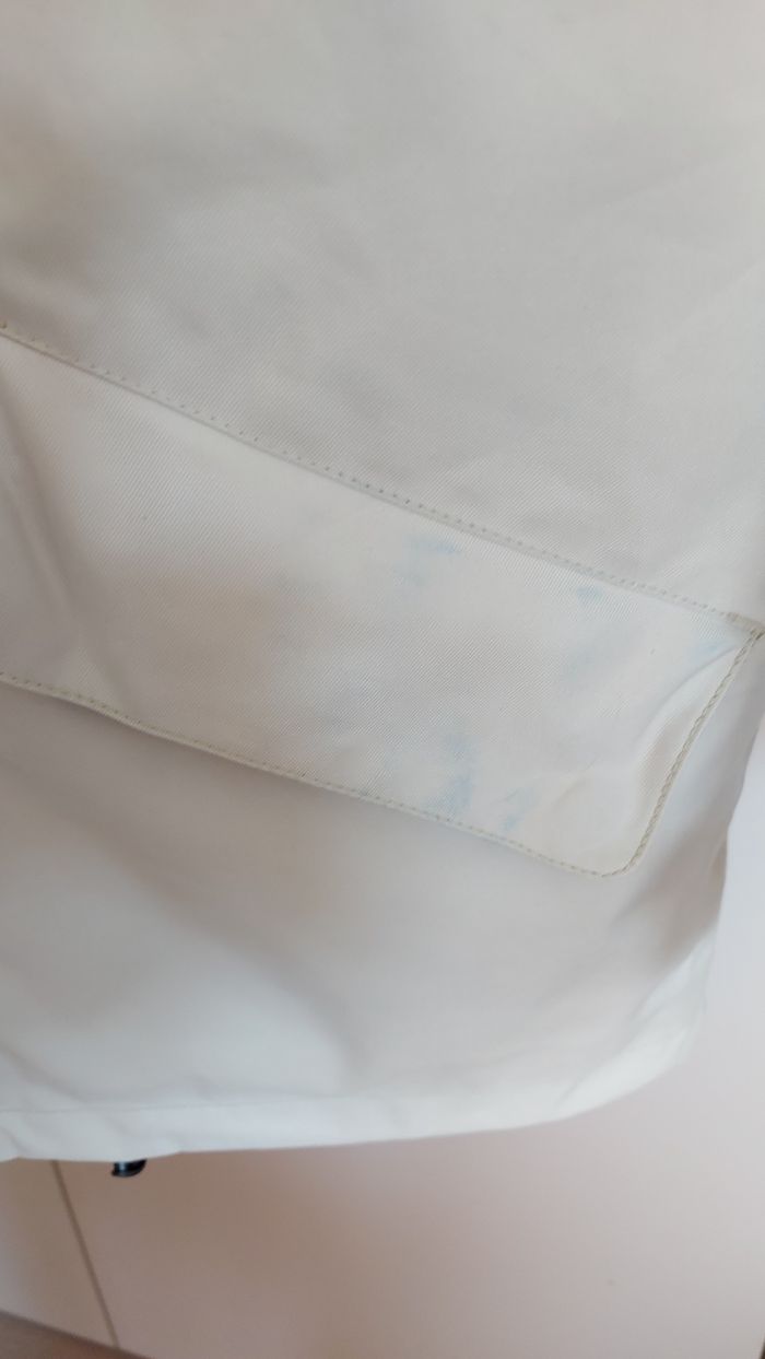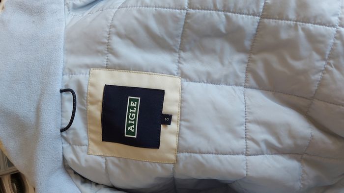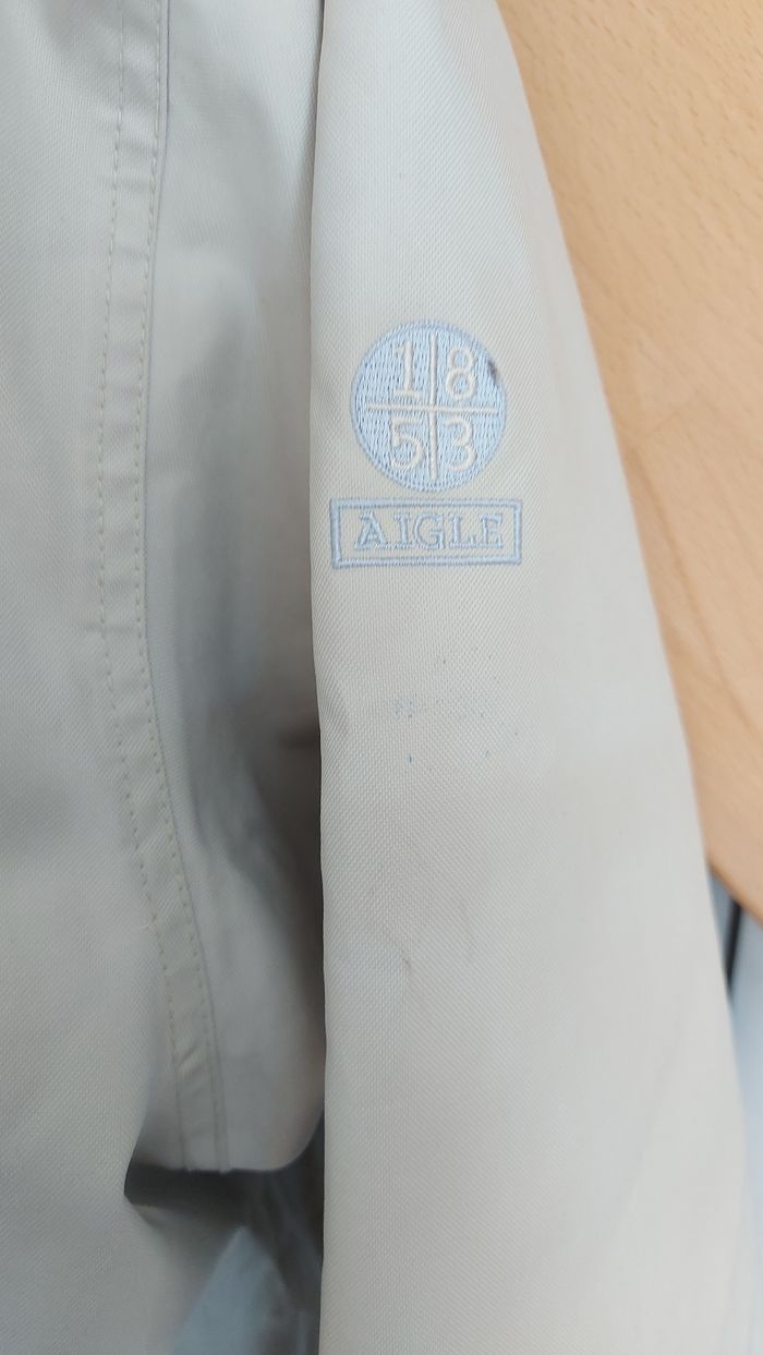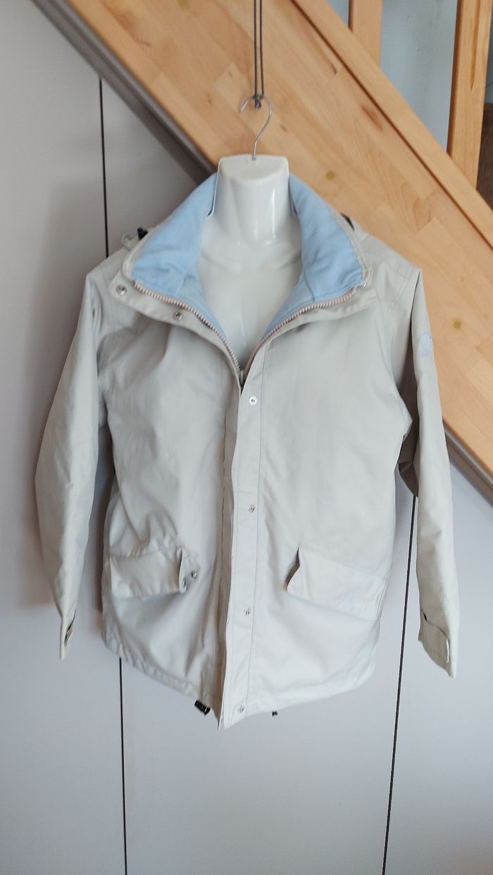 Veste imperméable, crème, intérieur bleu clair Aigle Taille S B état, des taches bleues sont apparues après le lavage et une tache au niveau du bras. Le tout en détail sur les photos