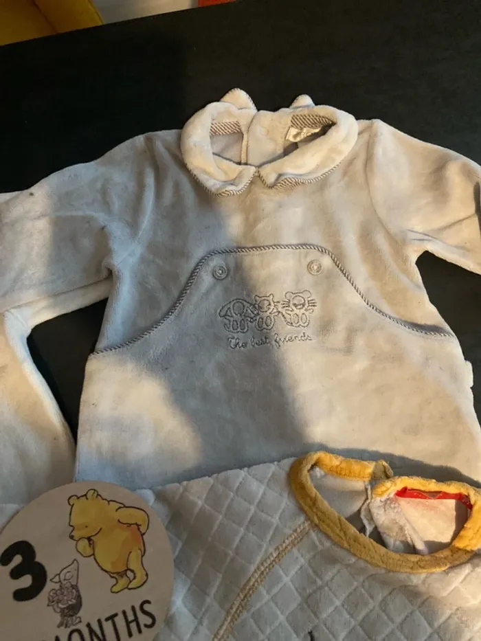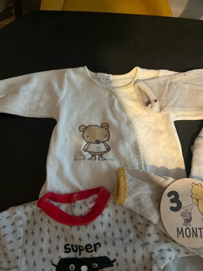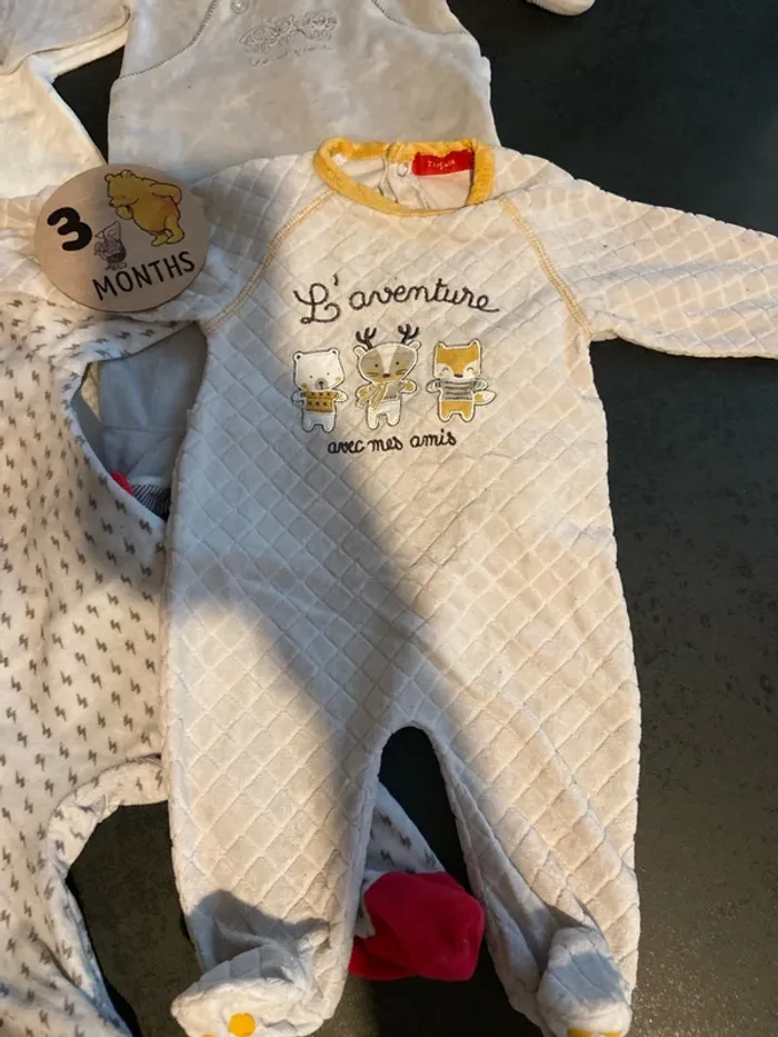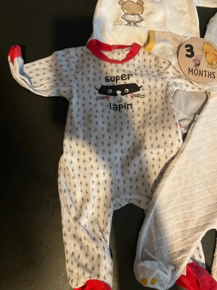 Lot de 4 pyjamas velours taille 3 mois Possibilité de commander à l’unité si tous ne vous plaisent pas, envoyez moi un message je ferais l’article seul dans mon dressing