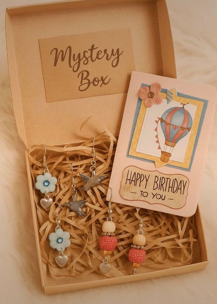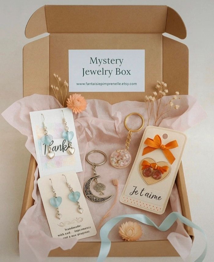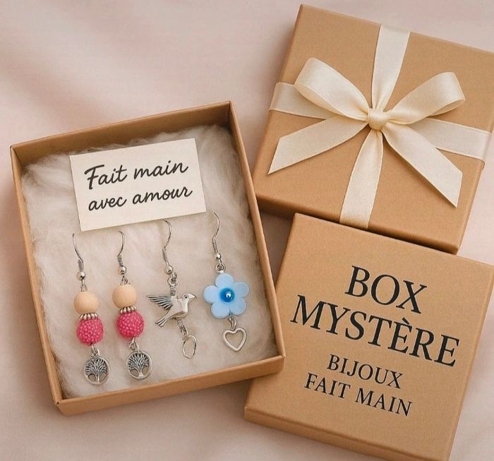 Envie d'une petite surprise rien que pour vous ou à offrir ? Découvrez ma box mystère de bijoux fantaisies faits main ! Chaque boîte est unique et contient une sélection de créations faites avec soin et créativité. 𝐀𝐭𝐭𝐞𝐧𝐭𝐢𝐨𝐧, 𝐥𝐚 𝐩𝐡𝐨𝐭𝐨 𝐧’𝐞𝐬𝐭 𝐪𝐮’𝐮𝐧 𝐞𝐱𝐞𝐦𝐩𝐥𝐞 Ce que vous pouvez recevoir : Boucles d'oreilles, bracelet, collier ou porte-clés, bijou de téléphone (soit 5 colliers ou 5 paires de boucles d'oreilles ou 5 bracelets ou 5 porte-clés ... ou un de chaque c'est vous qui choisissez... Des couleurs et motifs choisis avec attention pour un rendu élégant et original Personnalisation possible : Merci de me préciser lors de votre commande : La couleur que vous aimez le plus (ex : rose, bleu, argenté, bois...) Le type de bijou souhaité (ex : boucles d’oreilles, bracelet, surprise totale...) Fait main avec amour, chaque pièce peut présenter de légères imperfections qui en font tout le charme. Important : La photo est à titre d'exemple, ce ne sont pas exactement ces bijoux que vous recevrez, ni la même boîte mais d'autres créations originale, selon tes préférences.