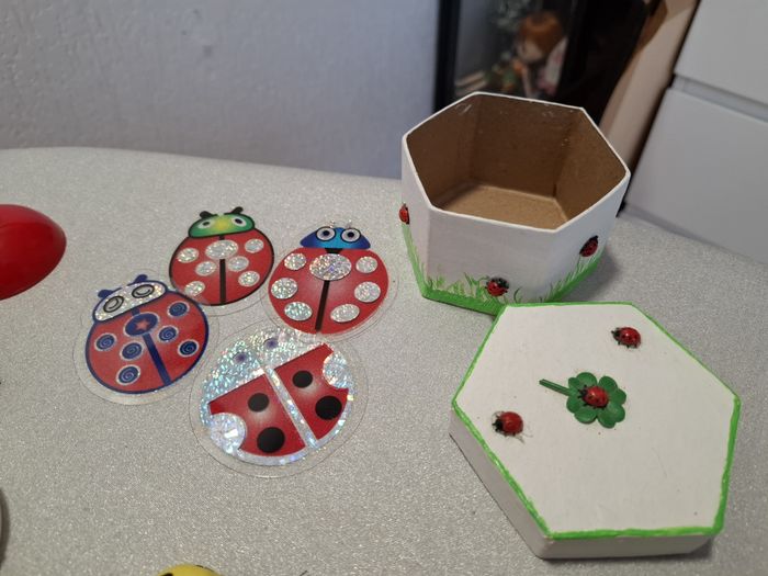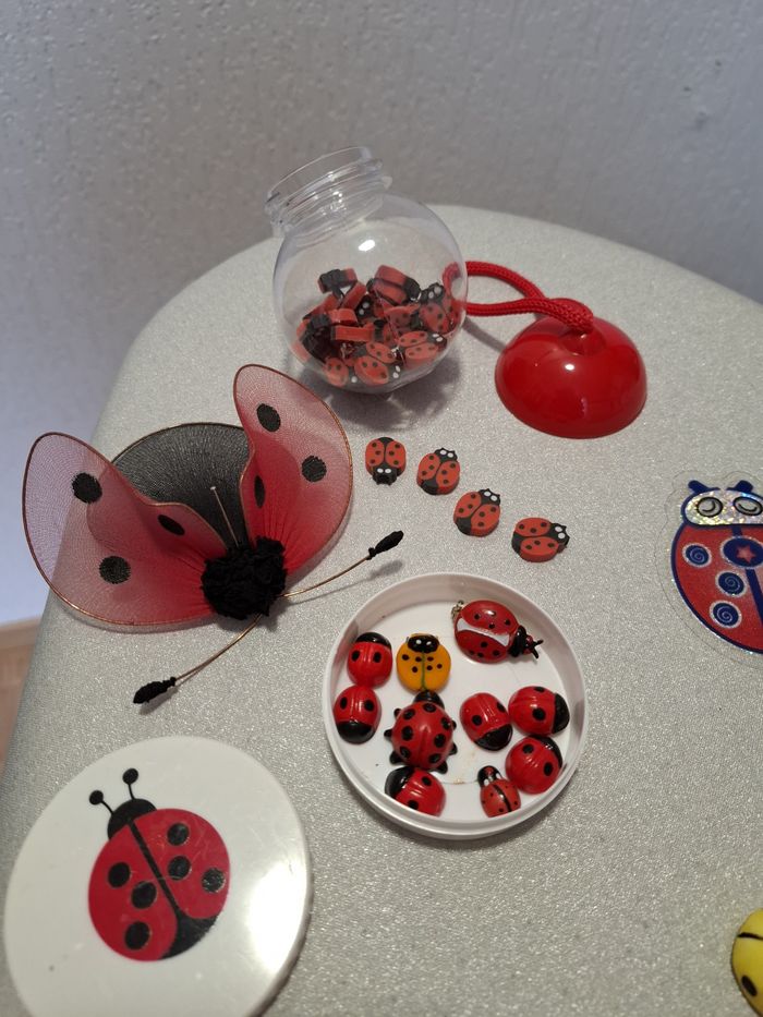 Joli lot de coccinelles pour décorations diverses ou scrapbooking, etc ... composé de : - 1 coccinelle pour rideau ou plante verte - 1 boîte ronde de 33 coccinelles en caoutchouc - 4 grosses coccinelles plastiques pailletées à suspendre - 7 coccinelles autocollantes dorées/rouges - 1 coccinelle jaune en polystyrène - 1 coccinelle rouge en plâtre peinte - 1 coccinelle bleu en céramique - 4 coccinelles en mousse autocollantes - 1 boîte à éponge blanche avec à l'intérieur une broche, une pince jaune et 8 coccinelles différentes formes et matières - 1 grosse boîte hexagonale (7,5 x 8 cm) en carton peinte et décorée de 8 petites coccinelles collées - et 6 belles coccinelles en verre Le tout pour la plupart neuf ou en très bon état.