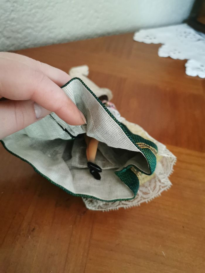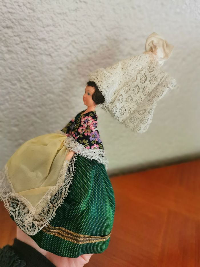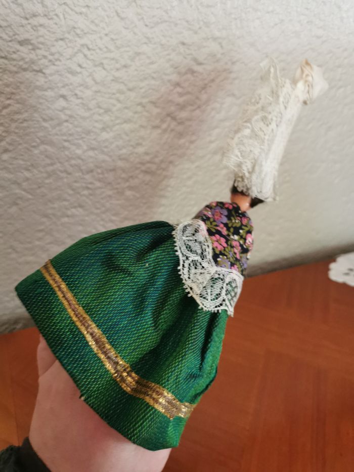 Poupée folklorique Champagne robe verte en tissu épais, tablier jaune bord en dentelle, la coiffe est en dentelle un peu jauni et a des traces de colle, châle à motif floraux en coton, bord en dentelle, dans l’ensemble reste ne très bon état. Taille : 21 cm Etat : TB Ancienneté : 1970/1980 Habits : coton, dentelle Matière : plastique/celluloïd