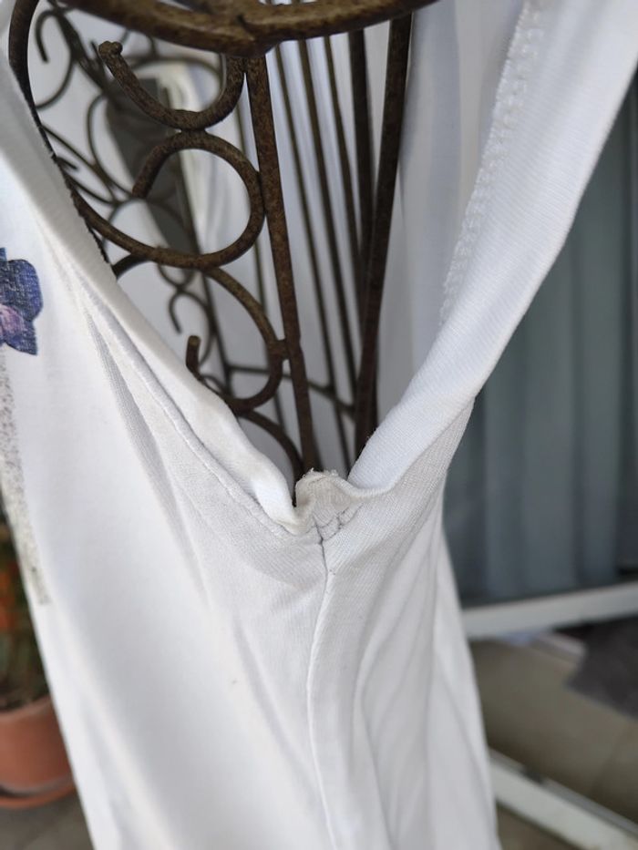 Joli T-shirt manches très très courtes avec un joli motif floral sur le devant un peu pailleté, légèrement jaunie sous les aisselles.