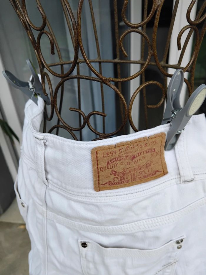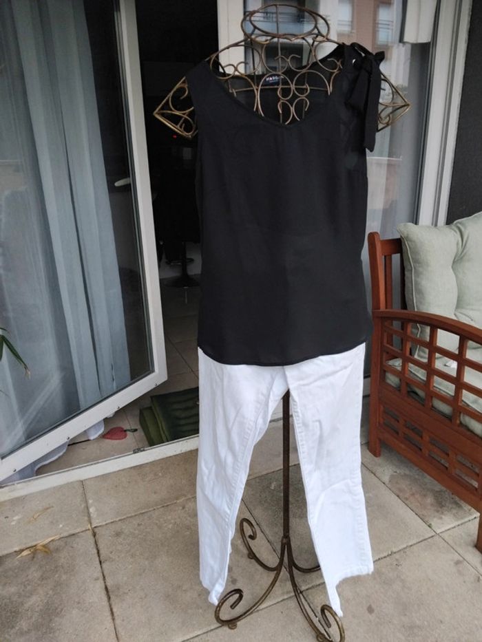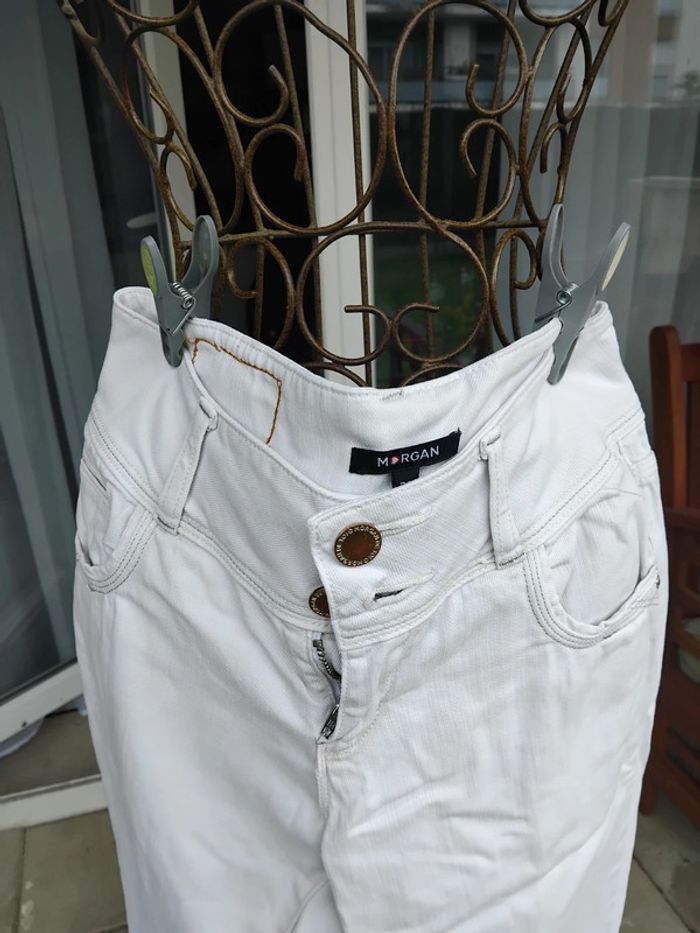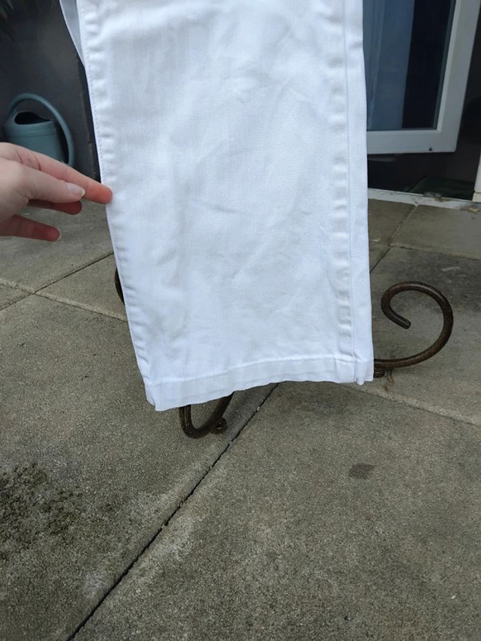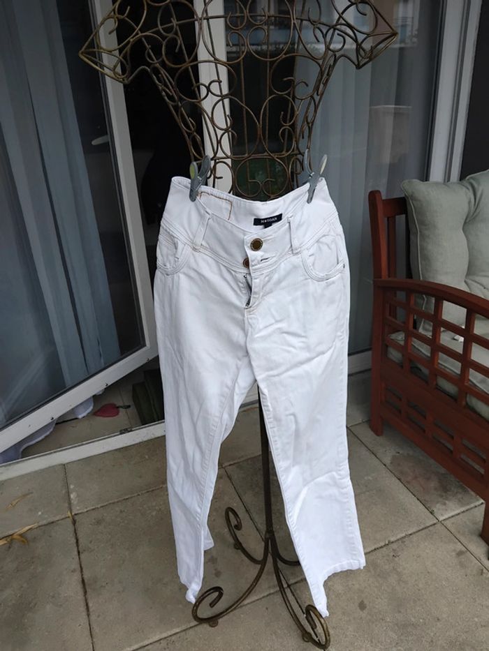 Jean blanc évasé en bas, se ferme par 2 boutons et une fermeture éclaire 2 poches sur chaque côté et 2 derrière.