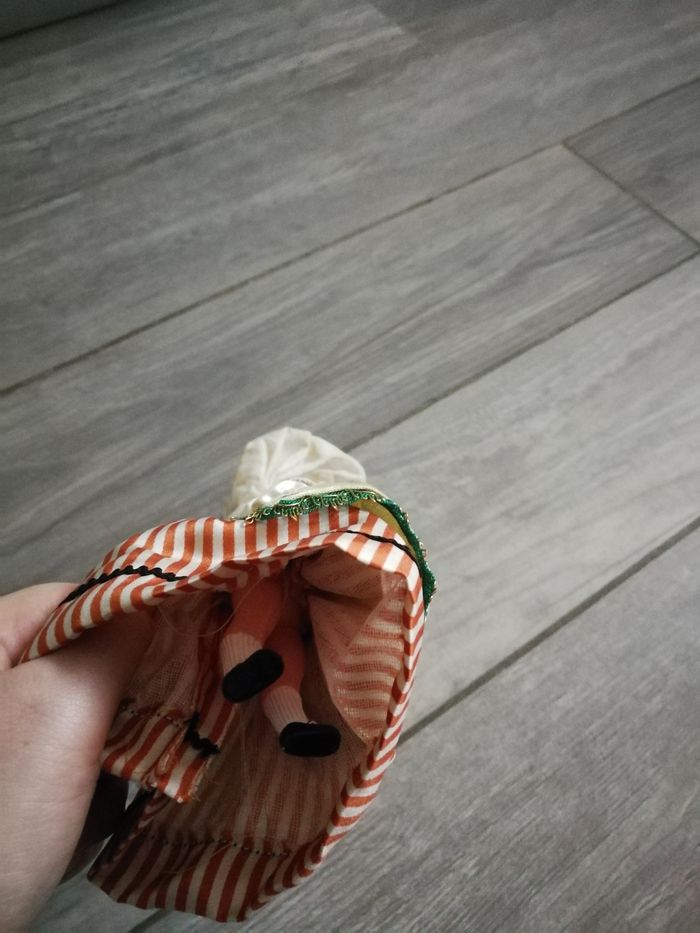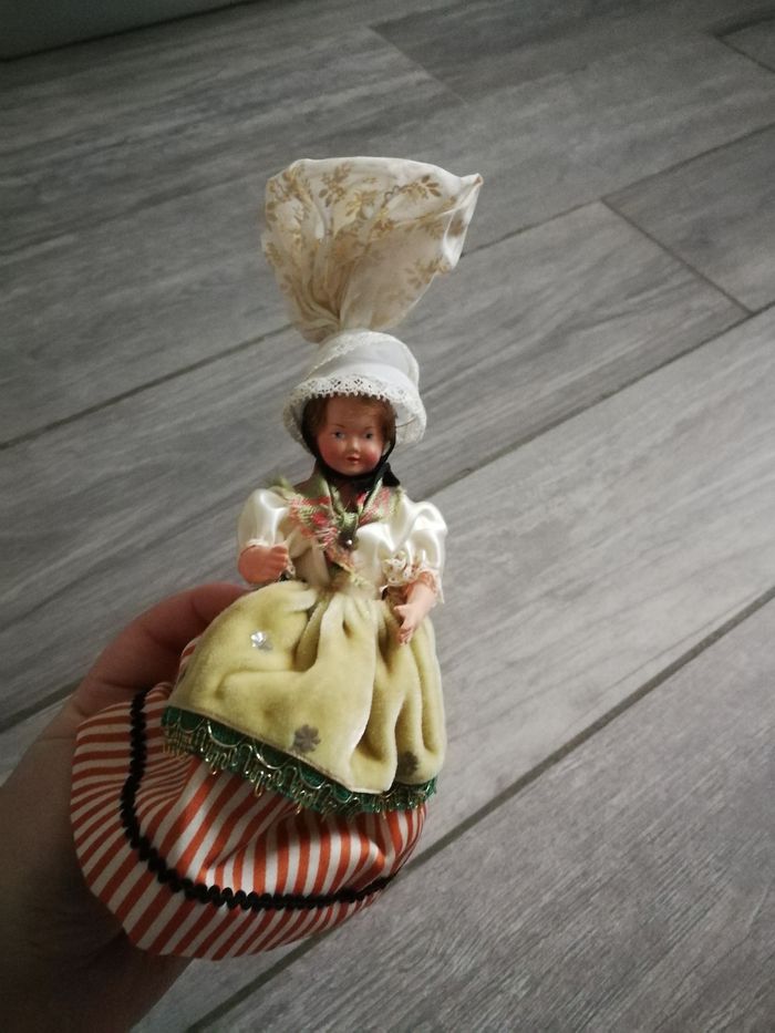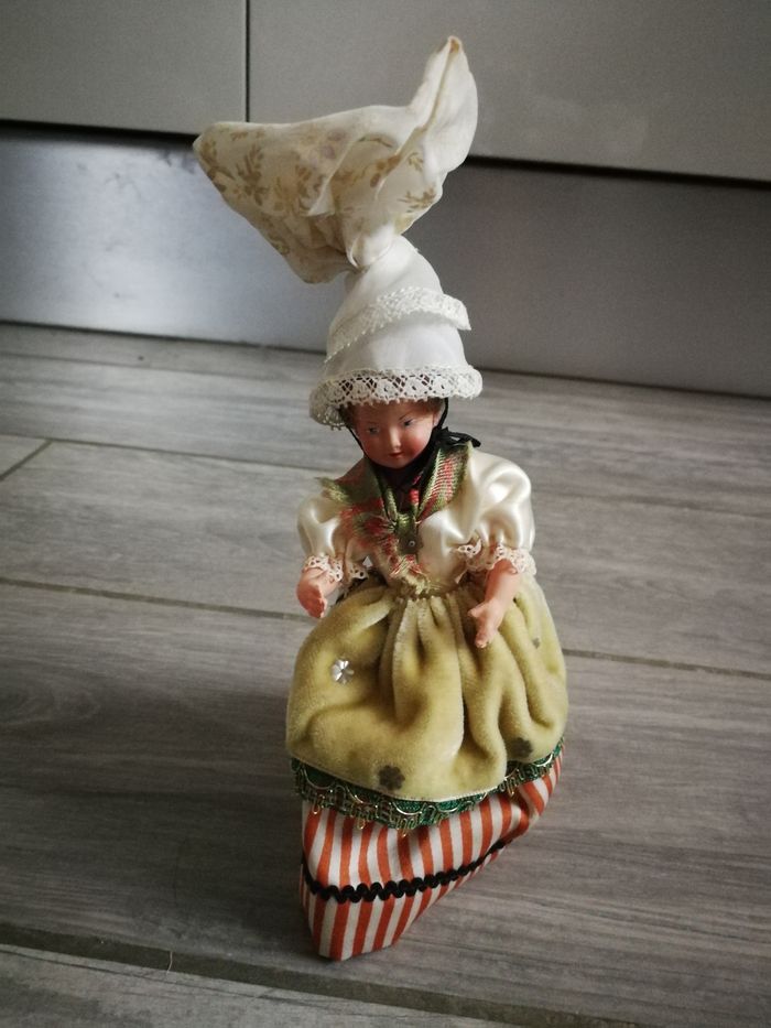 Poupée bigoudène ancienne robe rayée blanche et orange en organza, tablier vert anis en velours, blouse en satin écru, la coiffe ne tient pas sur son socle conique. Bel objet de collection tout de même, bon état général. Taille : 20 cm Etat : B Ancienneté : 1970/1980 Habits : organza, dentelle Matière : plastique/celluloïd