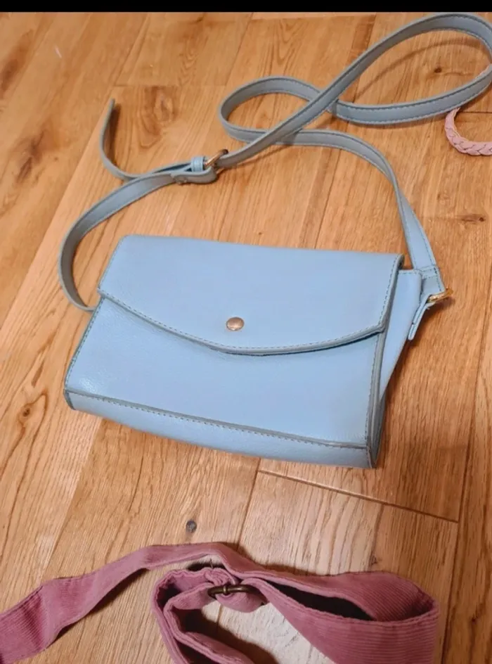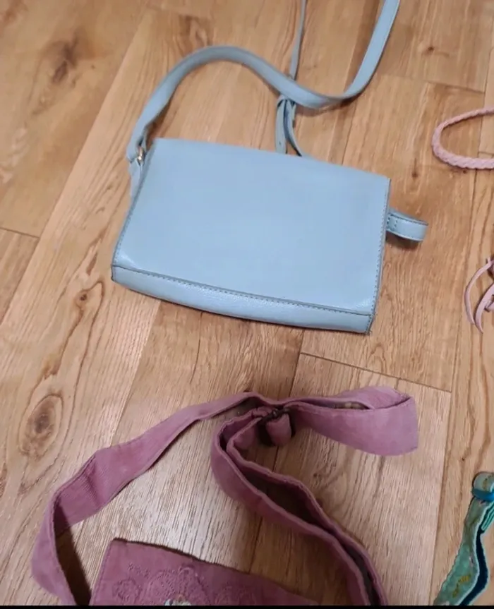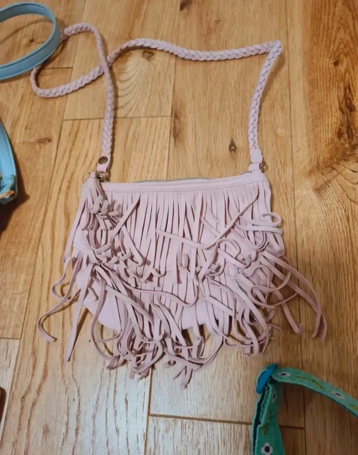Un sac rose à franges H&M Un sac bleu gemo Un sac velours rose du pareil au même Un sac vert et son porte monnaie bon etat #laetvict6ans