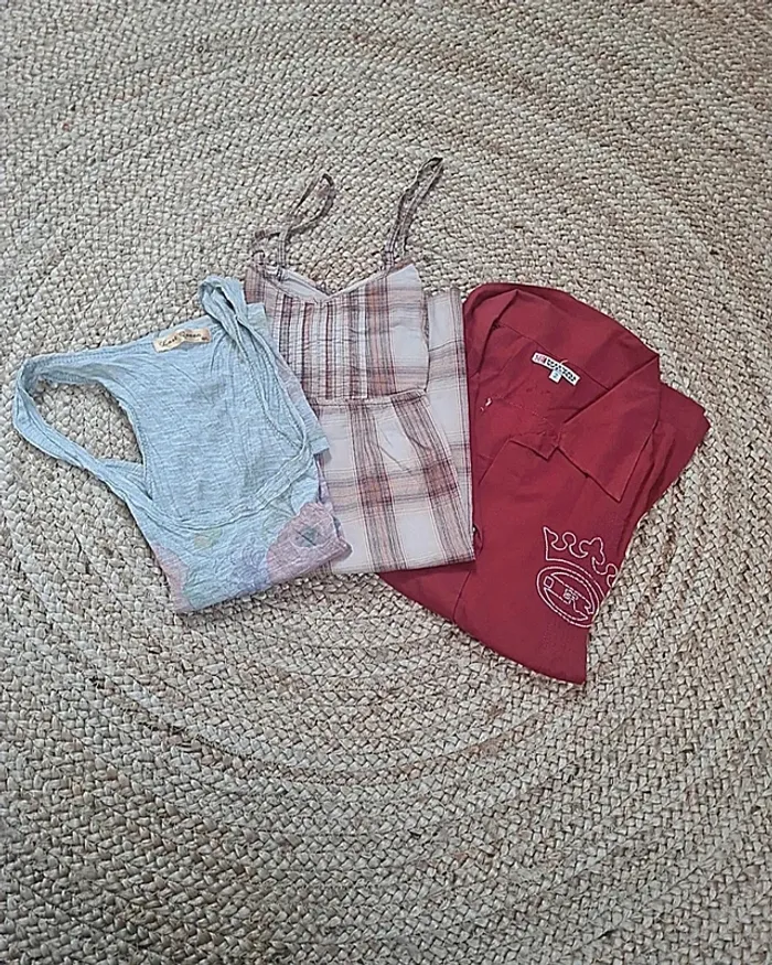 Chemise bordeaux Royal Wear T2 Debardeur gris TM Top bretelles à carreaux Bershka M Le tout en très bon état #laetab38