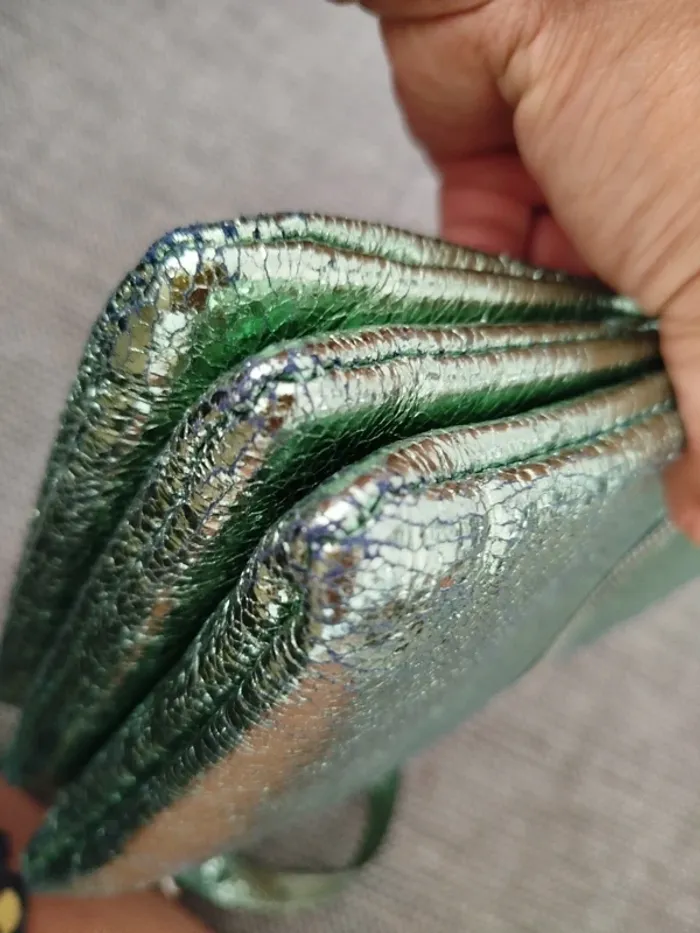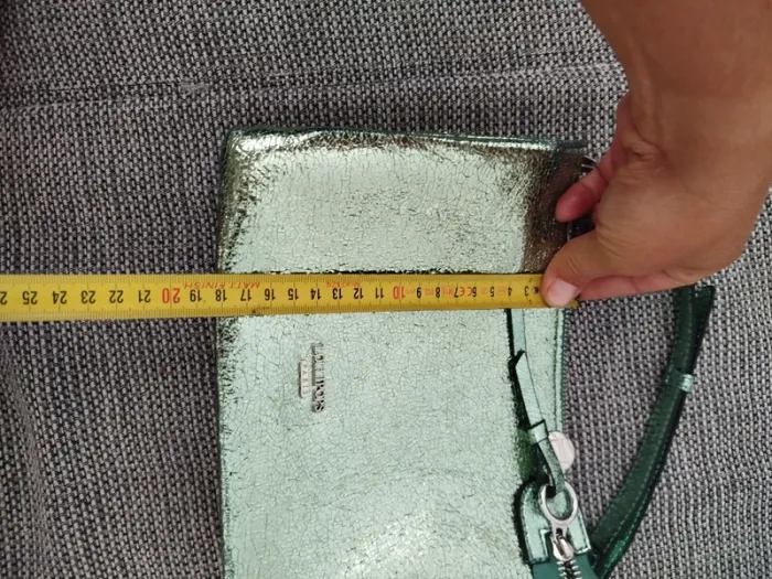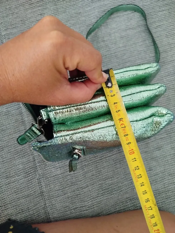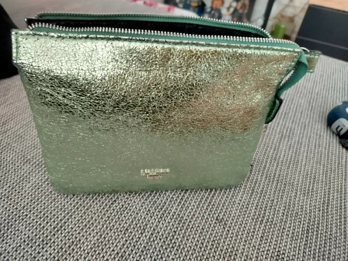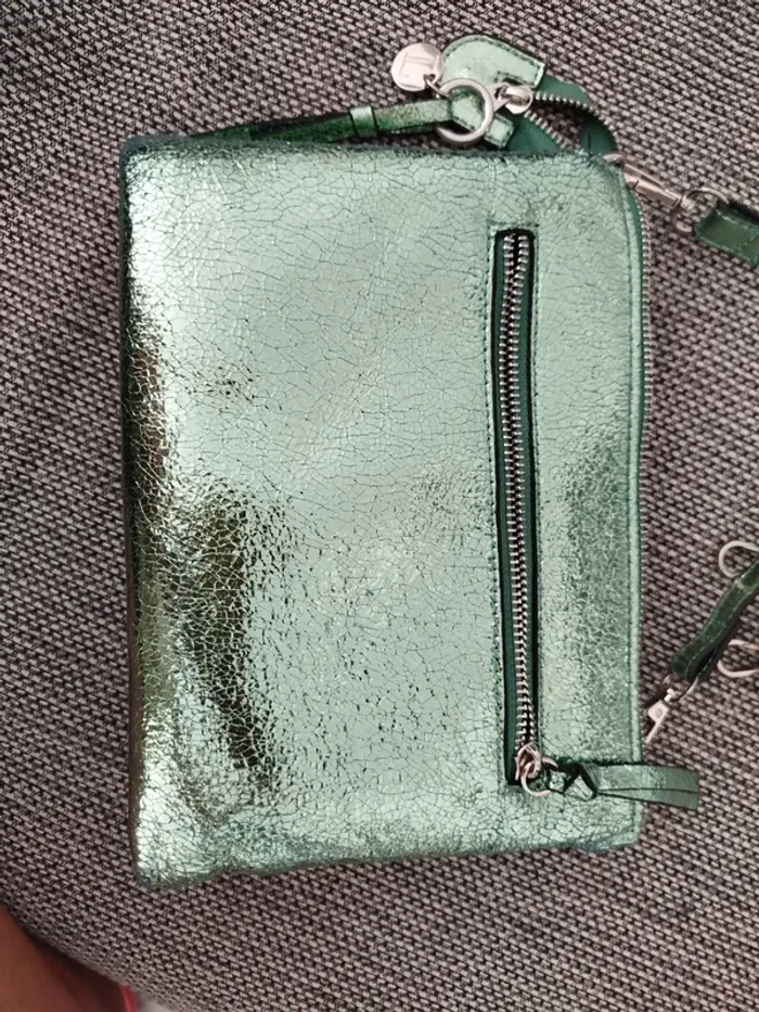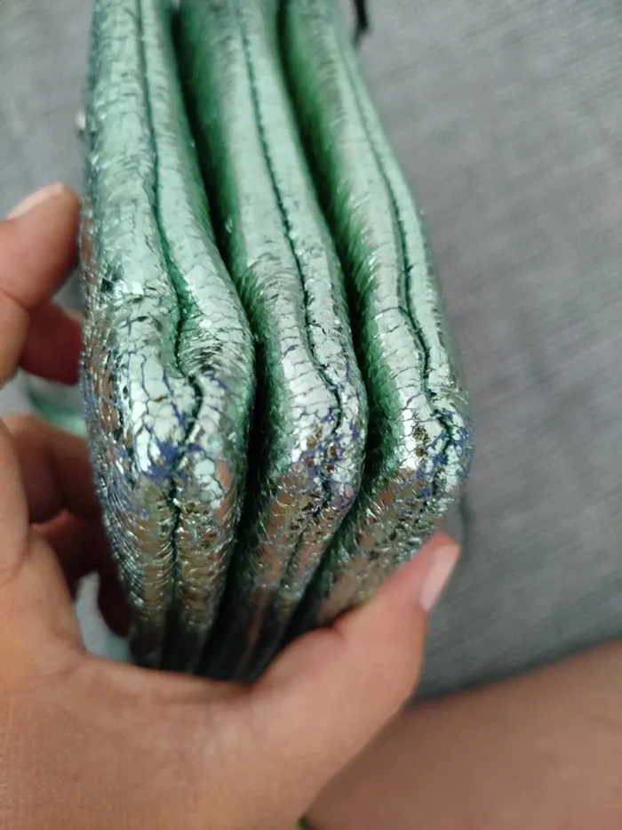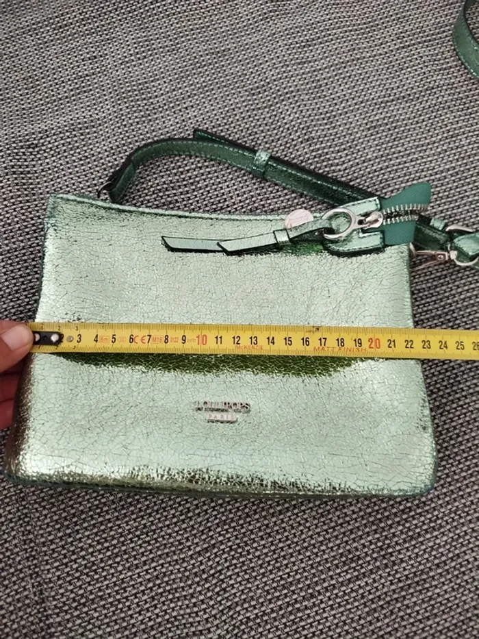 Très joli sac lollipops vert clair/menthe givrée texture métallisé Peut se porter aussi bien en bandoulière qu'en sac épaule grâce au réglage de la bandoulière (ou même en pochette si on l'enlève) Fourni avec une seconde bandoulière assortie, plus large et réglable également En très bon état, légers défauts aux coins et sur la bandoulière fine (voir photos) Dimensions en photo