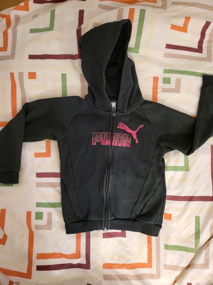Gilet Puma 7/8 ans / 128 cm Veste zippée à capuche Bon état Résidu d'étiquette de prénom sur l'étiquette (cf photo) Peinture écaillée sur la tirette de la fermeture éclair (cf photo)