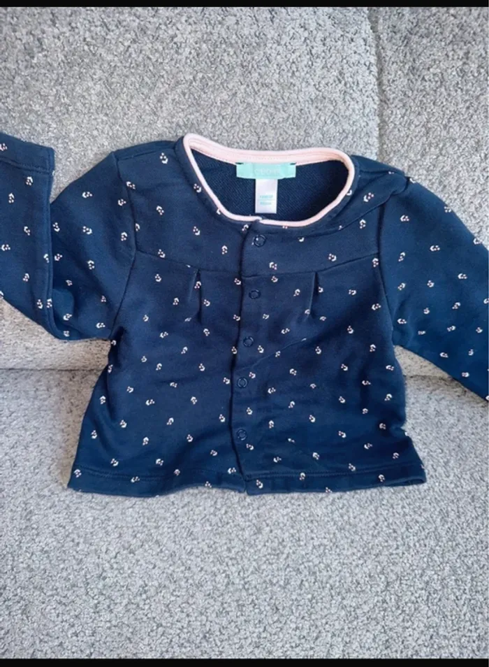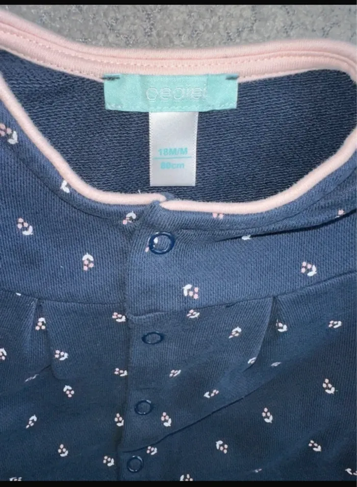 Chemisier / veste en coton de chez Obalbi. De couleur marine & rose, taille 18 mois. Jamais porté. J’ai également le bas assortis dans mon dressing. Maison non fumeur et sans animaux.