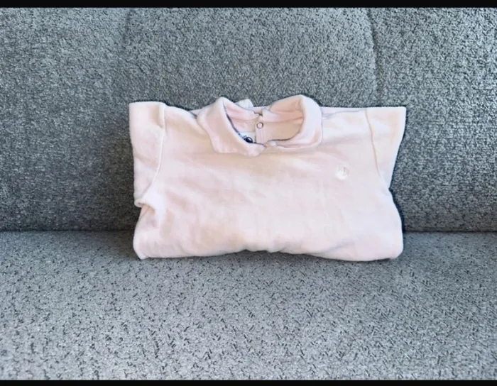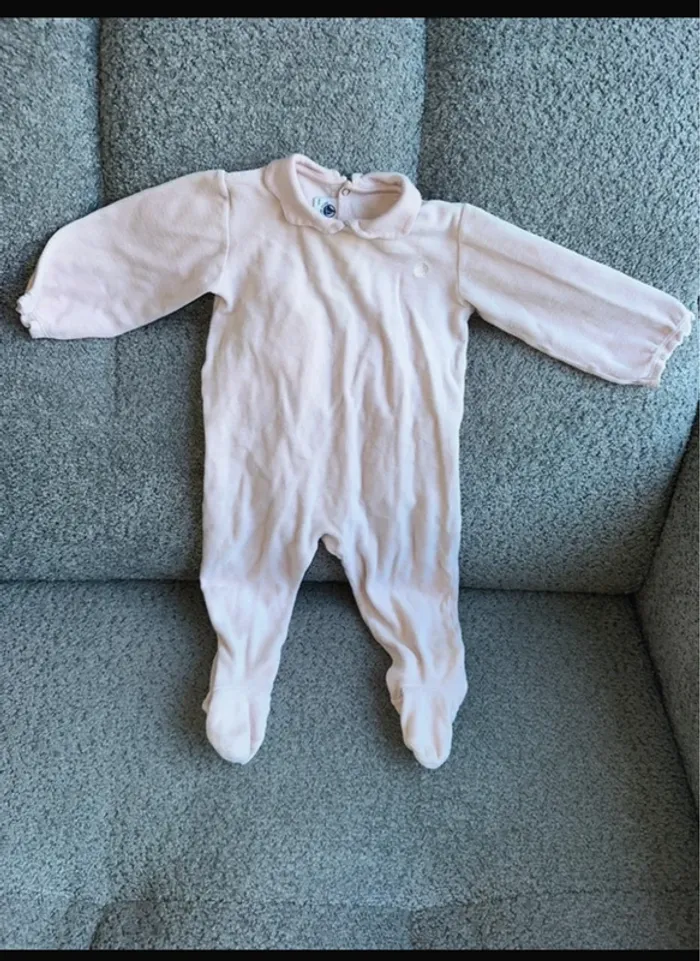 Pyjama / grenouillère en velours rose avec col Claudine col pétale col volanté de la marque Petit Bateau. C'est une taille 18 mois. Comme neuf, porté seulement une fois par ma fille. Maison non fumeur et sans animaux.