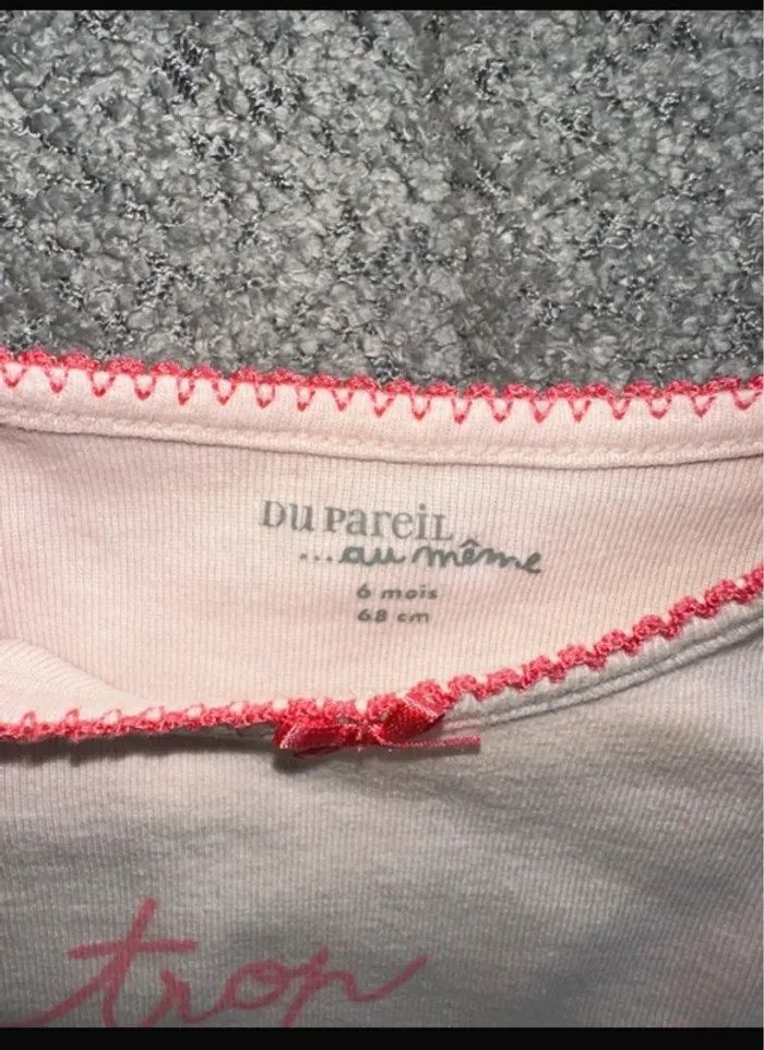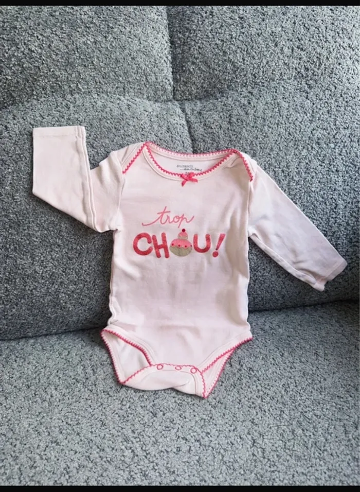 Bodie manches longues de couleur rose avec inscription trop chou ! De chez Du Pareil Au Même. Taille 6 mois. Neuf jamais porté. Maison non fumeur et sans animaux.