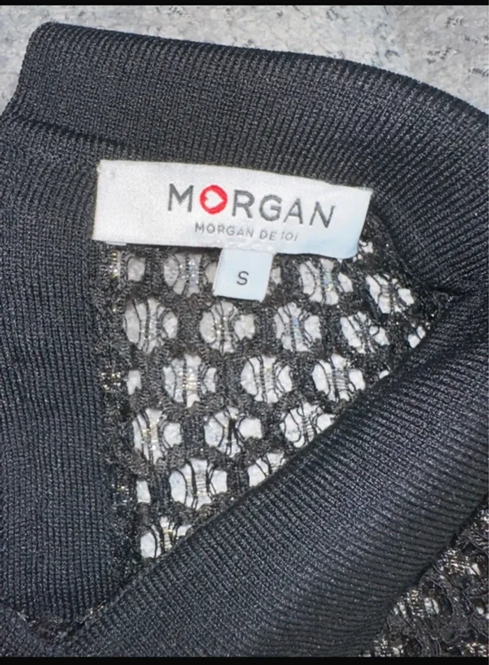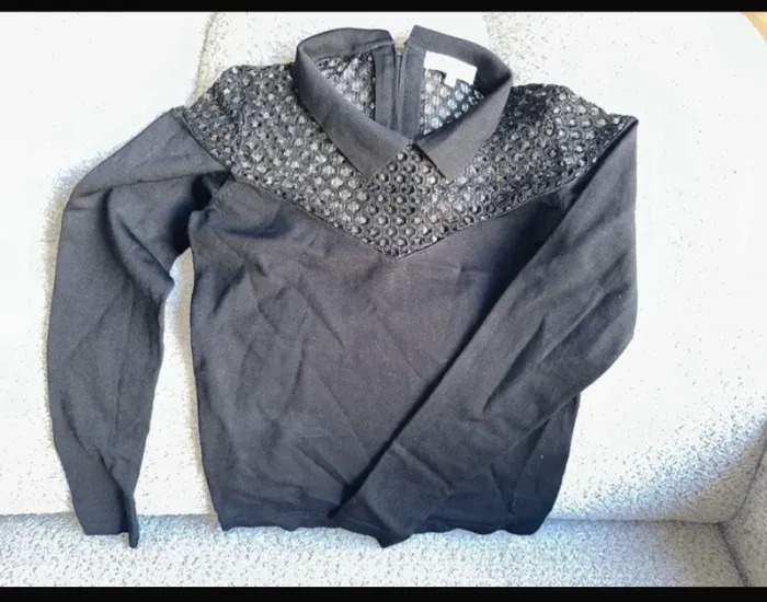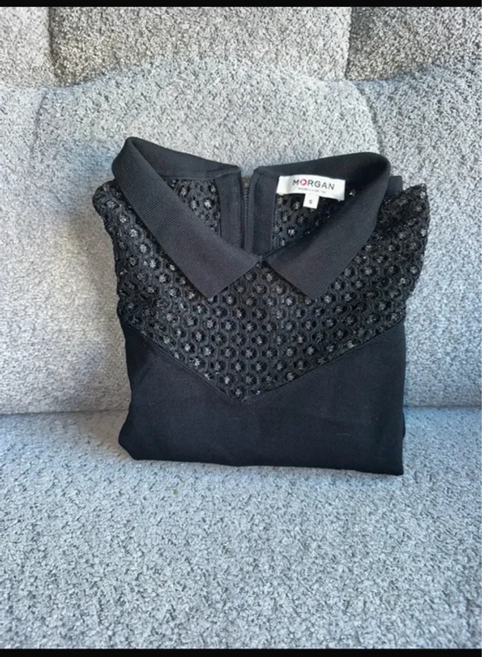 Haut / Pull / t shirt manches longues noir cintré et ajouré sur le haut de la poitrine avec liserés doré et petit col Claudine / col polo de chez Morgan. C'est une taille S. Neuf, jamais porté. Maison non fumeur et sans animaux.