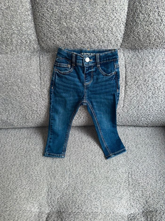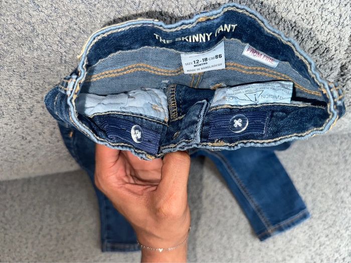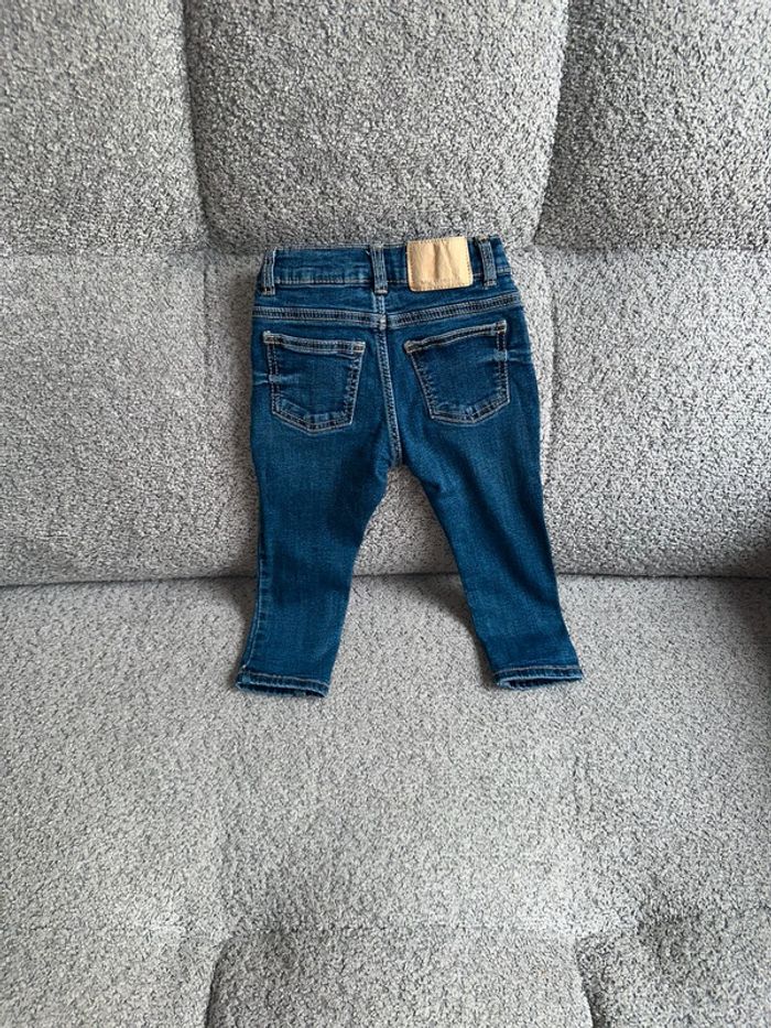 Jean skinny bleu de chez Zara. C’est une taille 12-18 mois (86cm). Ceinture réglable avec élastique. Comme neuf, porté seulement une fois par ma fille. Maison non fumeur et sans animaux.
