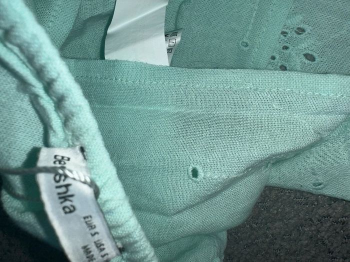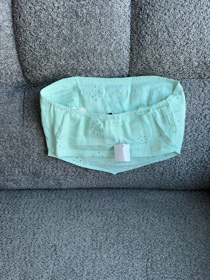 Magnifique crop top bustier en broderie anglaise de couleur vert d’eau de chez Bershka. C’est une taille S. Neuf avec étiquette. Maison non fumeur et sans animaux.