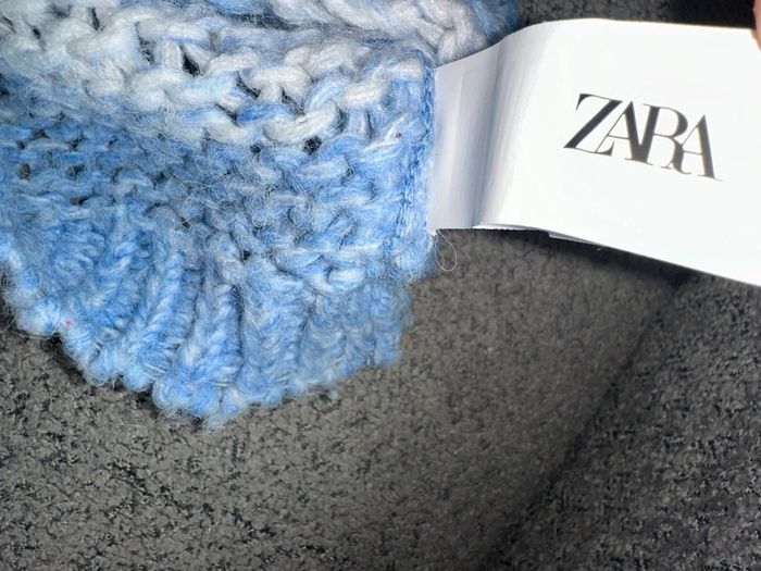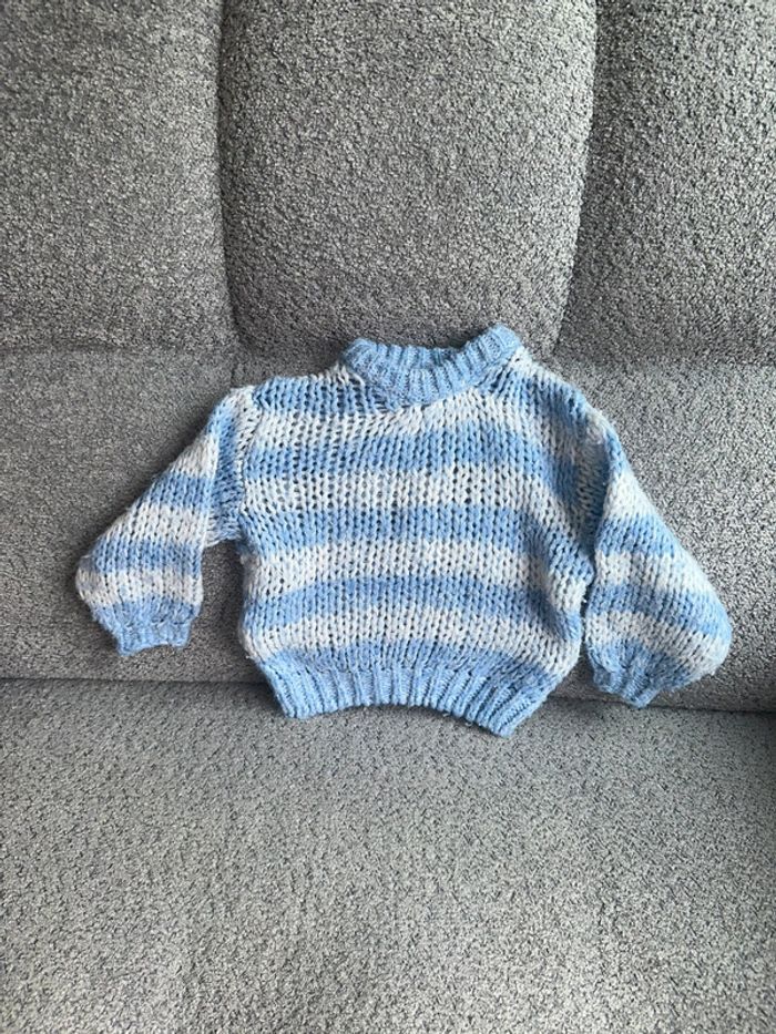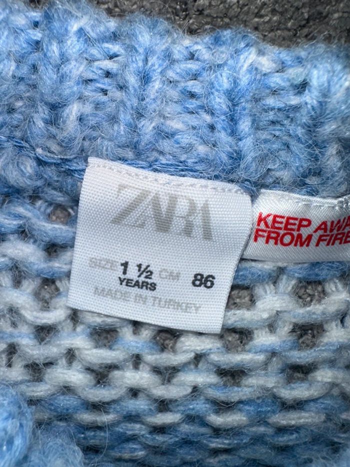 Pull grosse maille ajourée de couleur blanc et bleu de chez Zara. C’est une taille 24 mois (86cm). Porté seulement 2-3 fois par ma fille. Maison non fumeur et sans animaux.