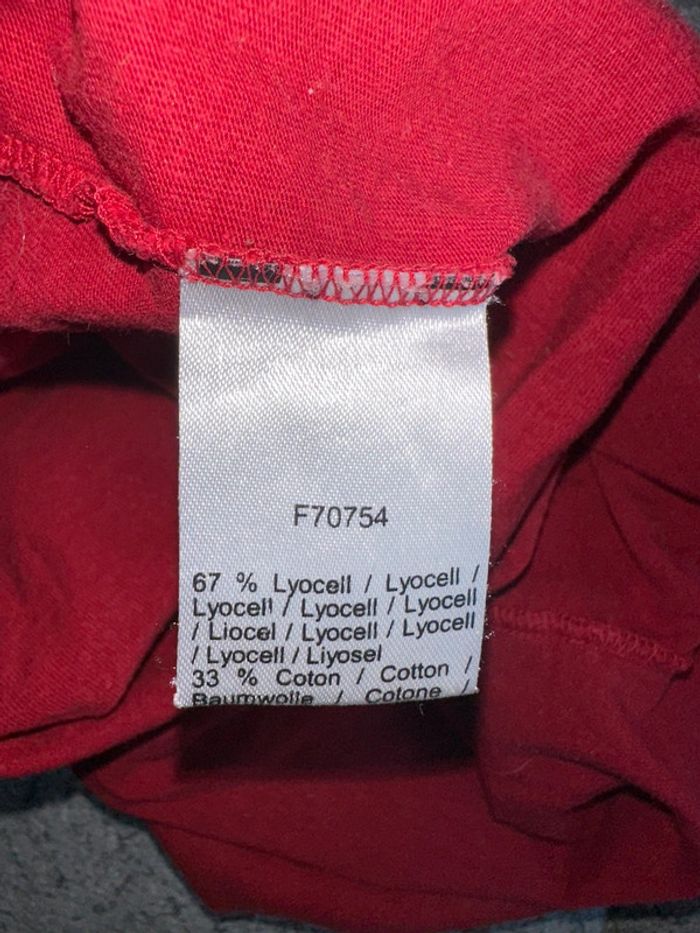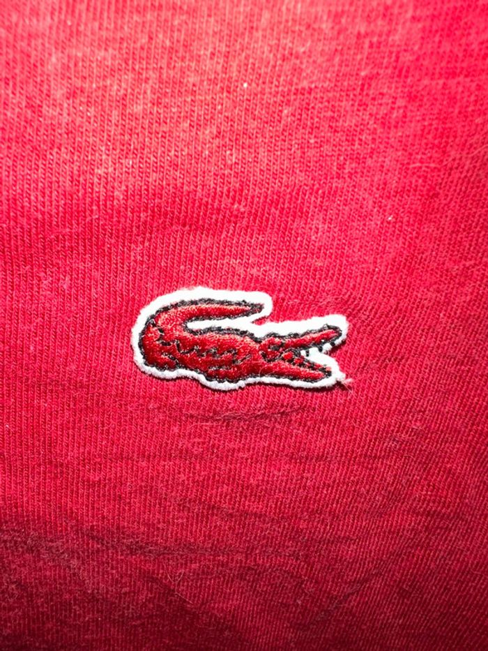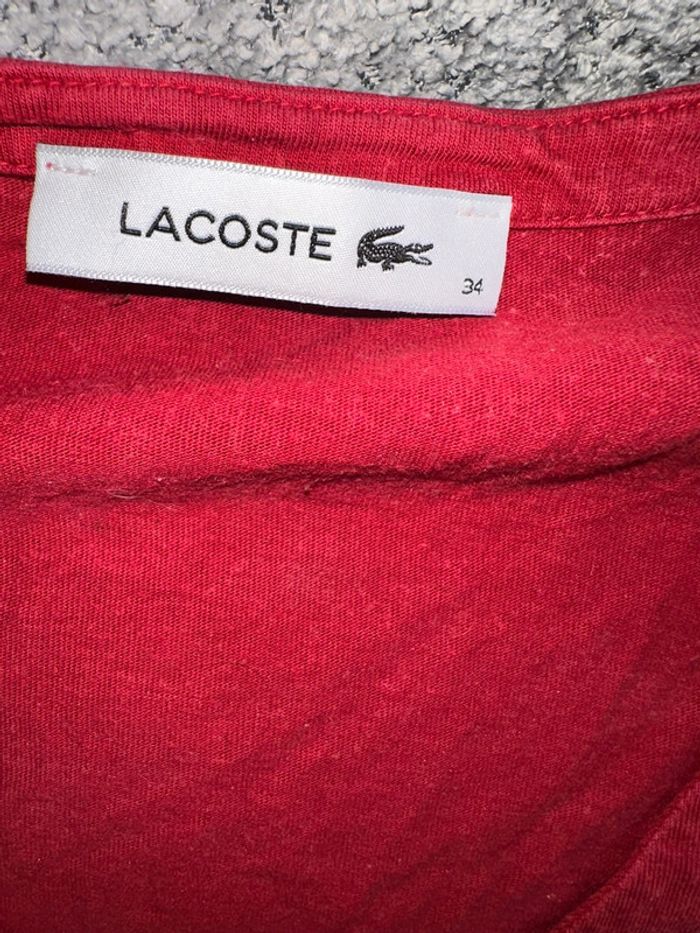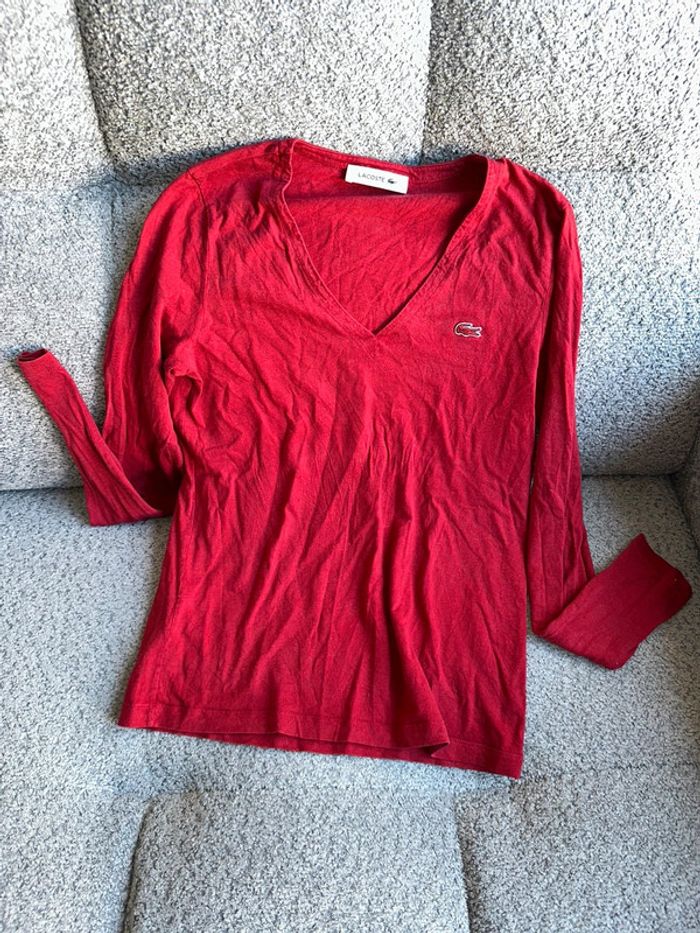 T shirt manches longues rouge de chez Lacoste. C’est une taille 34. Excellent état. Maison non fumeur et sans animaux.
