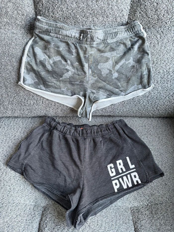 Lot de 2 shorts de sport, 1 gris et 1 militaire kaki de chez Jennyfer. ce sont tous les 2 des tailles S. Portés mais reste en excellent état. Maison non fumeur et sans animaux