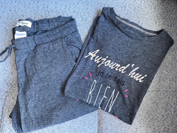 Ensemble 2 pièces (1 pantalon + 1 t shirt manches courtes) pyjama gris Etam. Taille XS pour le haut, taille S pour le bas. Excellent état. Maison non fumeur et sans animaux.