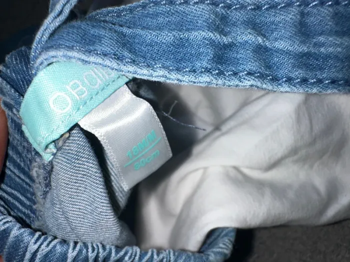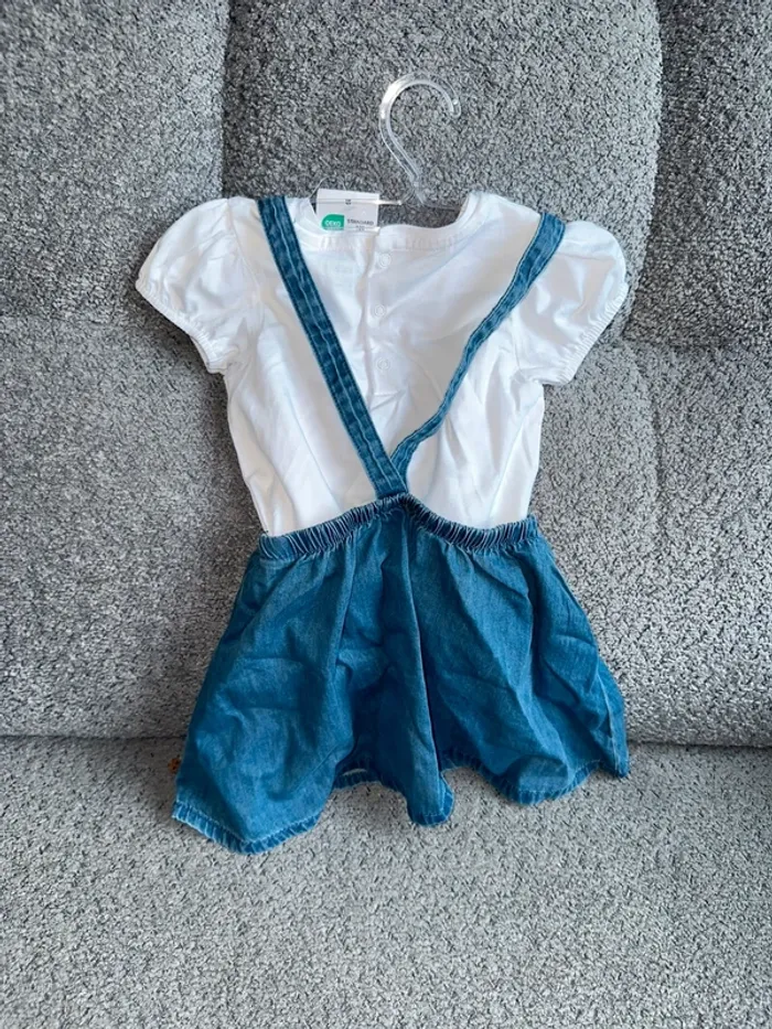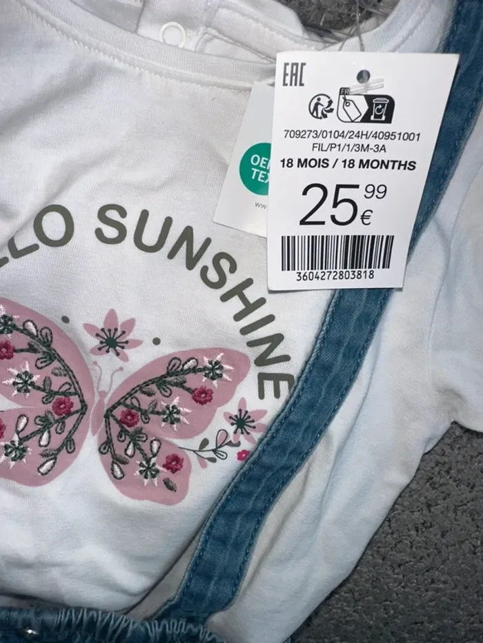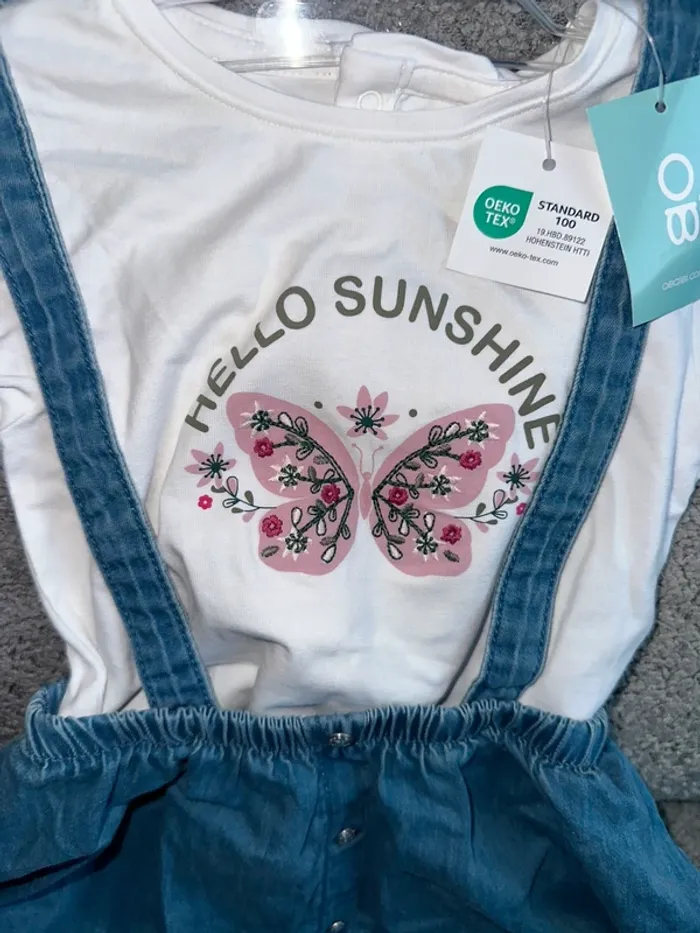 Ensemble t shirt blanc motif papillon fleuri rose et kaki et sa robe en jean bleu de chez Obaïbi, bretelles de la robe réglables par bouton. Taille 24 mois, neuf avec étiquette. Maison non fumeur et sans animaux.