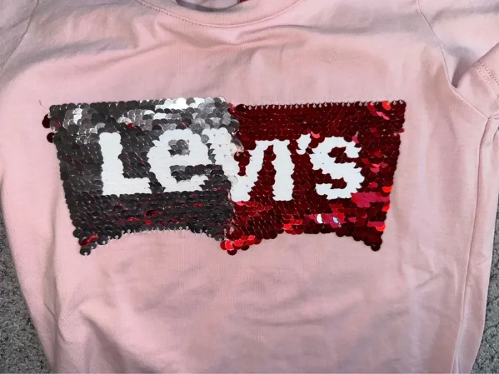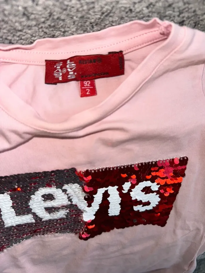 T-shirt à sequins réversibles couleur rose de chez Levi’s. Peu porté très bon état. Taille 92cm. Maison non fumeur et sans animaux.