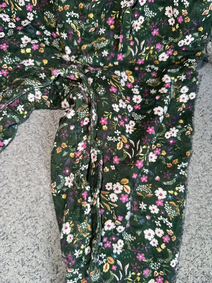 Combinaison verte à fleurs de chez Tape à l’œil. Boutons pressions à l’entrejambe. C’est une taille 24 mois. Porté une fois, comme neuf. Maison non fumeur et sans animaux.