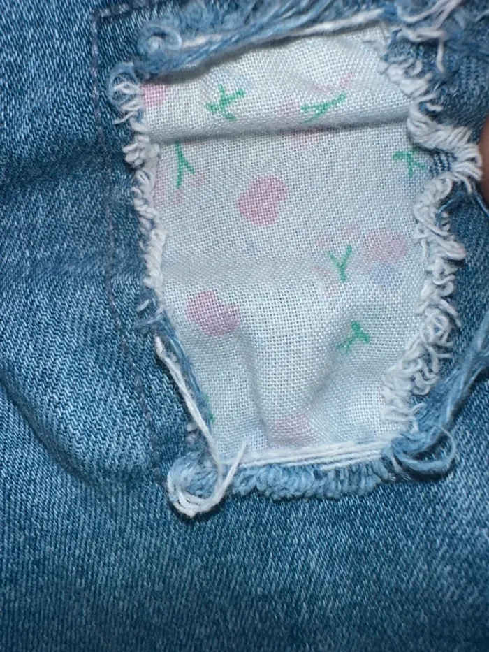 Jean skinny bleu déchiré avec tissu fleuri de chez Tape à l’œil. Ceinture réglable par élastique. C’est une taille 18 mois. Porté, mais encore en excellent état. Maison non fumeur et sans animaux.