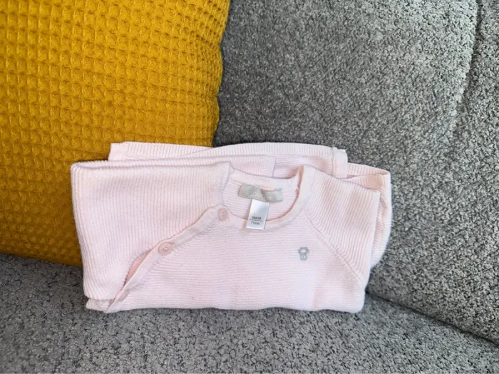 Gilet / brassière / cardigan en maille chaude de couleur rose pâle de chez Obaïbi. C'est une taille 9 mois, neuf, jamais porté par ma fille. Maison non fumeur et sans animaux.