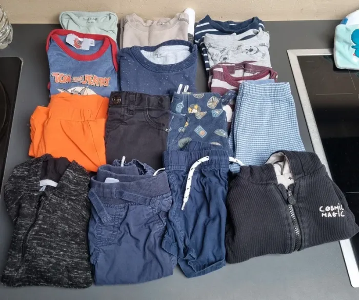 En très bon état, différentes marques, 2 bodys, 1 veste, 1 combinaison, 1 ensemble, 4 pantalons, 1 short, 2 pulls, 3 t-shirts