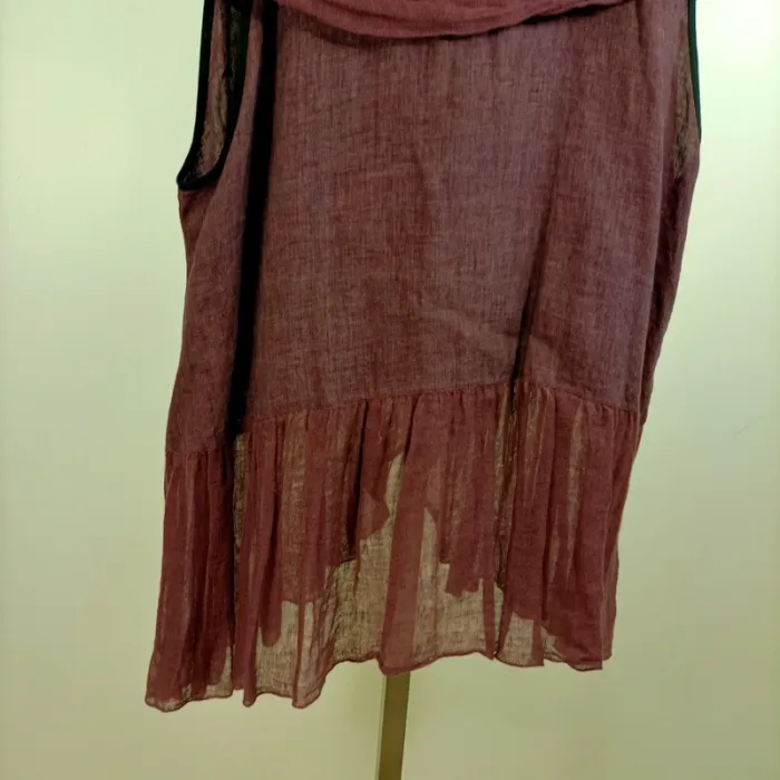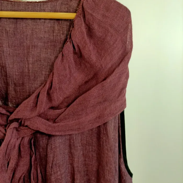 tunique bohème chic, haut léger été, blouse fluide femme, tunique créateur, vêtement éthique, look hippie chic, style festival, tunique oversize, top ample original, pièce unique, tunique asymétrique, tunique bordeaux, tunique fluide à superposer, haut sans manches femme, vêtement d'artisanat, créateur français, coupe libre, lin mélangé, mode naturelle