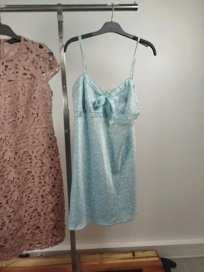 3 Robe satinée bleu ciel à bretelles – Nœud poitrine, fines bretelles réglables, matière douce et fluide.