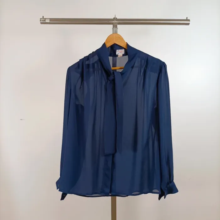 Blouse vintage bleu marine fluide transparente nœud lavallière manches longues Taille 40 est A1350