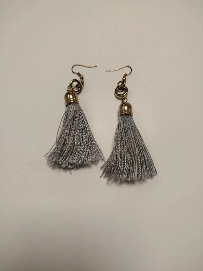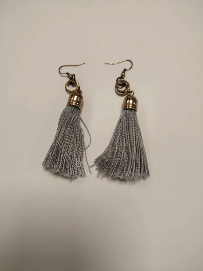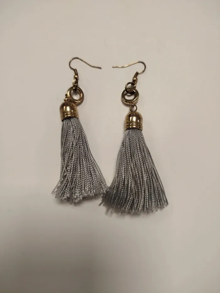 ⚠️ LIRE ATTENTIVEMENT LA DESCRIPTION ⚠️ 🚀 Envoi rapide 💎 État 8/10 - Bon état Paire de boucles d’oreilles pendantes ornées de pompons gris clair en fil textile, montées sur un crochet doré vieilli. Structure légère, agréable à porter au quotidien comme en soirée. Style bohème chic facile à assortir avec une tenue d'été, un look décontracté ou une robe fluide. Un des fils présente un léger dépassement (voir photo), mais ne nuit pas au port. Toutes les ventes sont reversées intégralement à l'association Amitié Partage, association à but non lucratif qui vient en aide aux plus démunies. Votre achat n'est pas seulement un vêtement, c'est un véritable soutien à notre association. boucles d’oreilles pompon, bijoux bohème chic, gris clair, accessoires été, oreilles percées tassel earrings, light grey, boho chic jewelry, summer accessory, lightweight dangle orecchini con nappine, grigio chiaro, stile boho, accessori estate, pendenti Quasten-Ohrringe grau, Boho Schmuck, Sommeraccessoire, leichte Ohrringe Damen